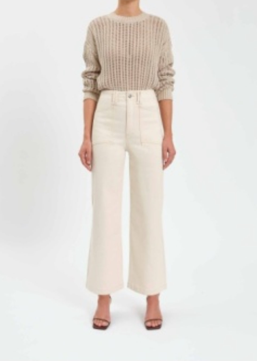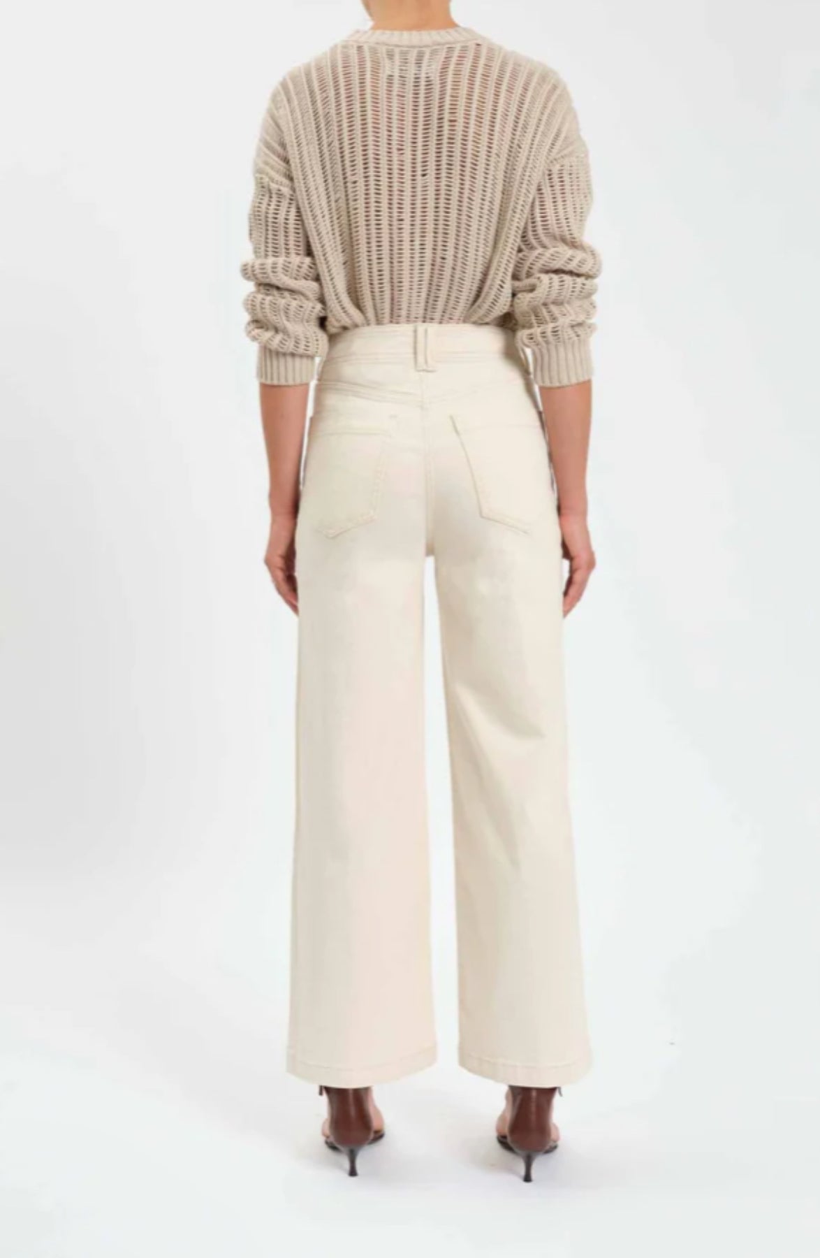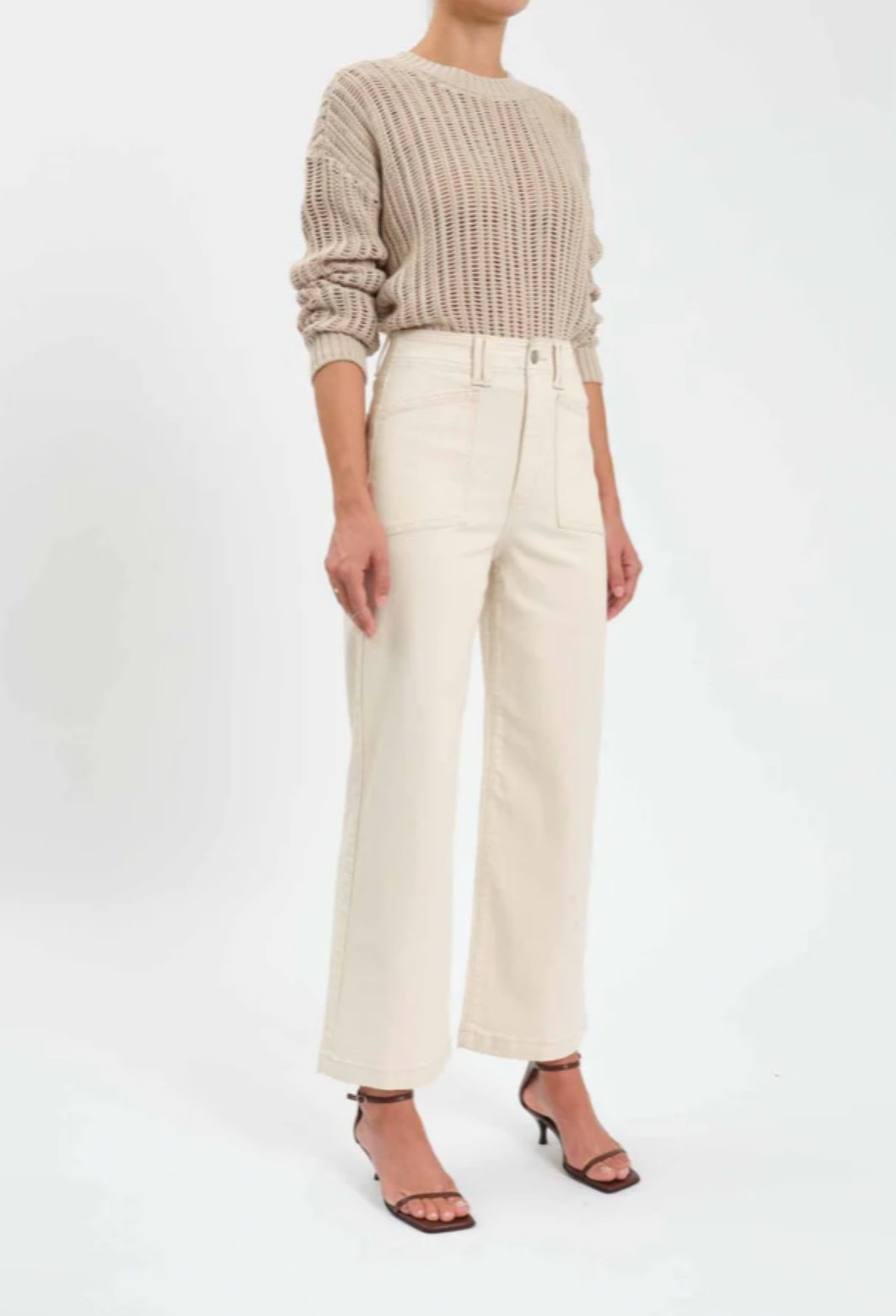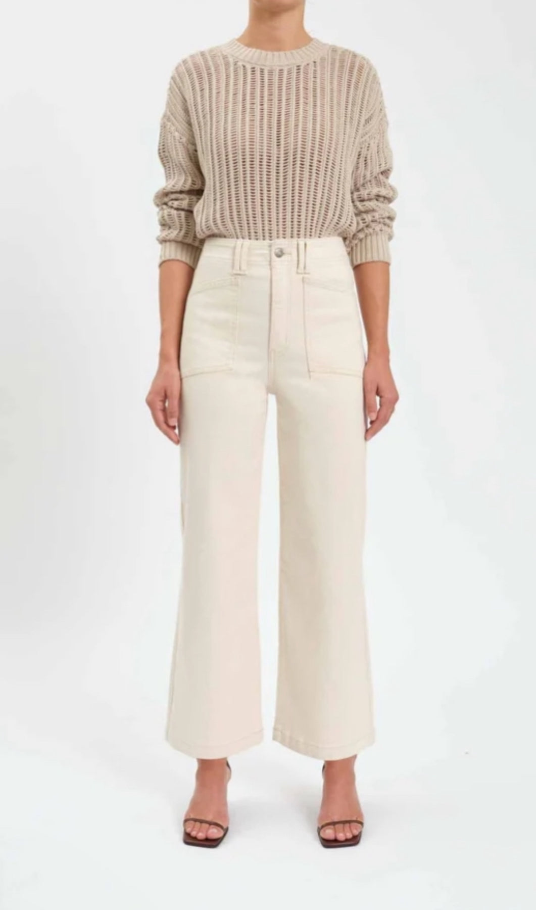 Inspired by LA's hottest neighborhood, the Valley Girl in Sunny is a high rise wide leg featuring retro-inspired patch pockets and a cream coloured wash. Constructed from our Tough Love fabric, this jean holds its shape but yields to your body in all the right ways.
