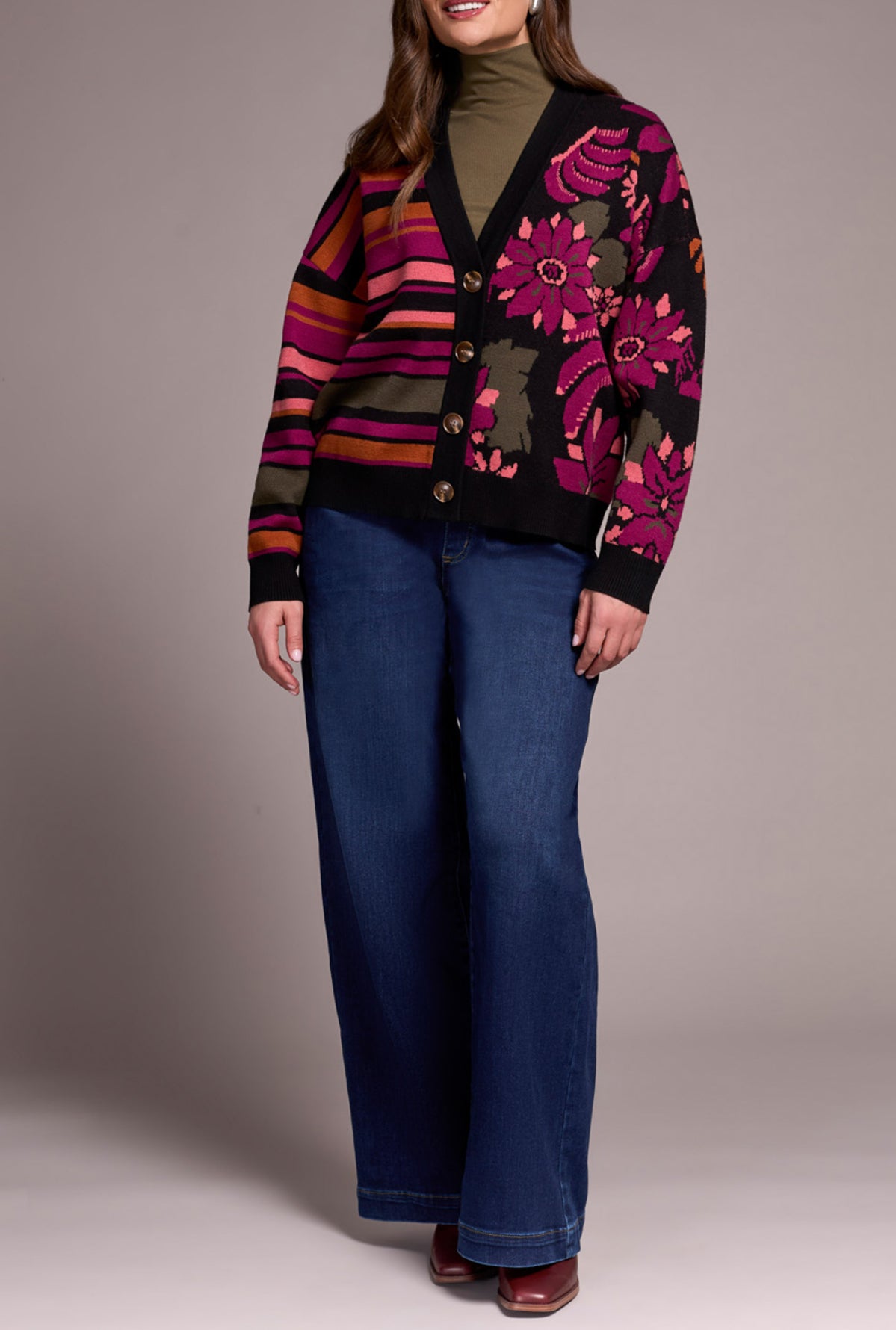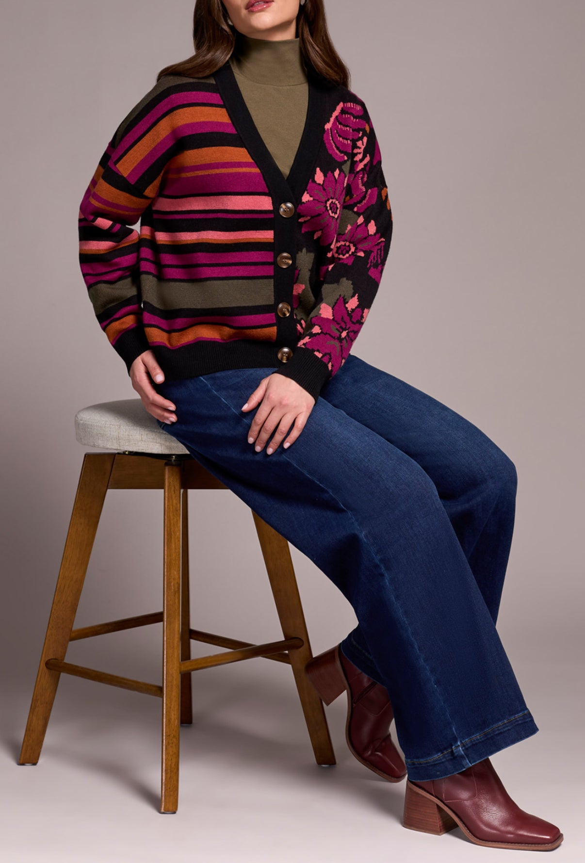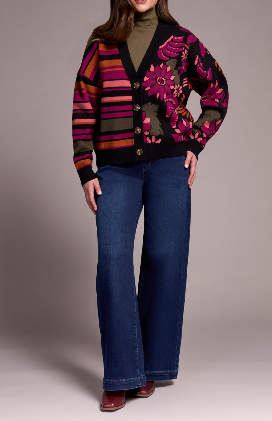 Infuse your look with elevated style in this striking cardigan, featuring a refined mix of stripe and argyle patterns, complemented by contrast diamond stitch detailing along the sleeves. The buttoned front allows you to wear it open for a relaxed vibe or securely fastened for a polished finish on cooler days.