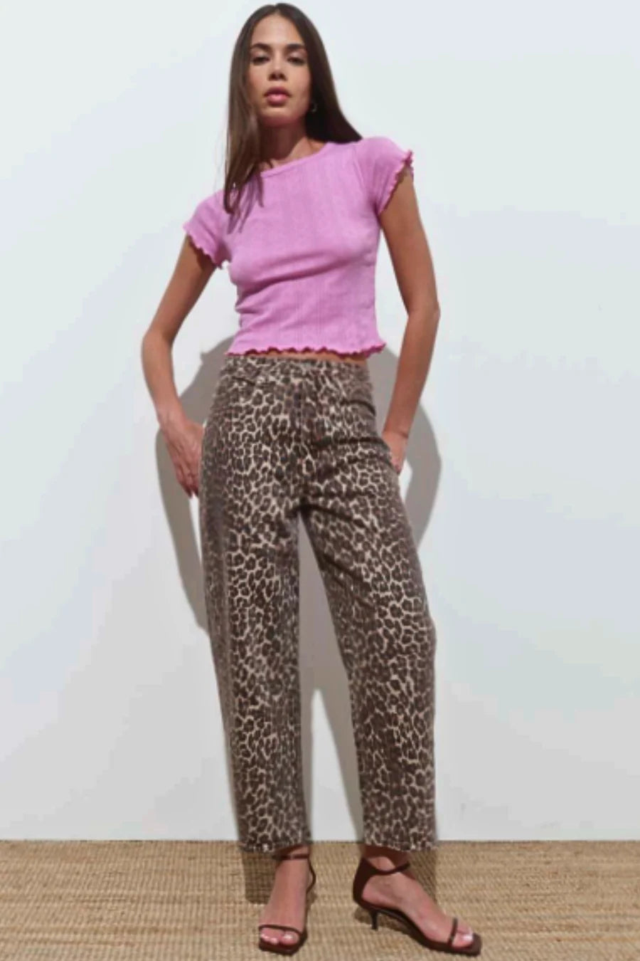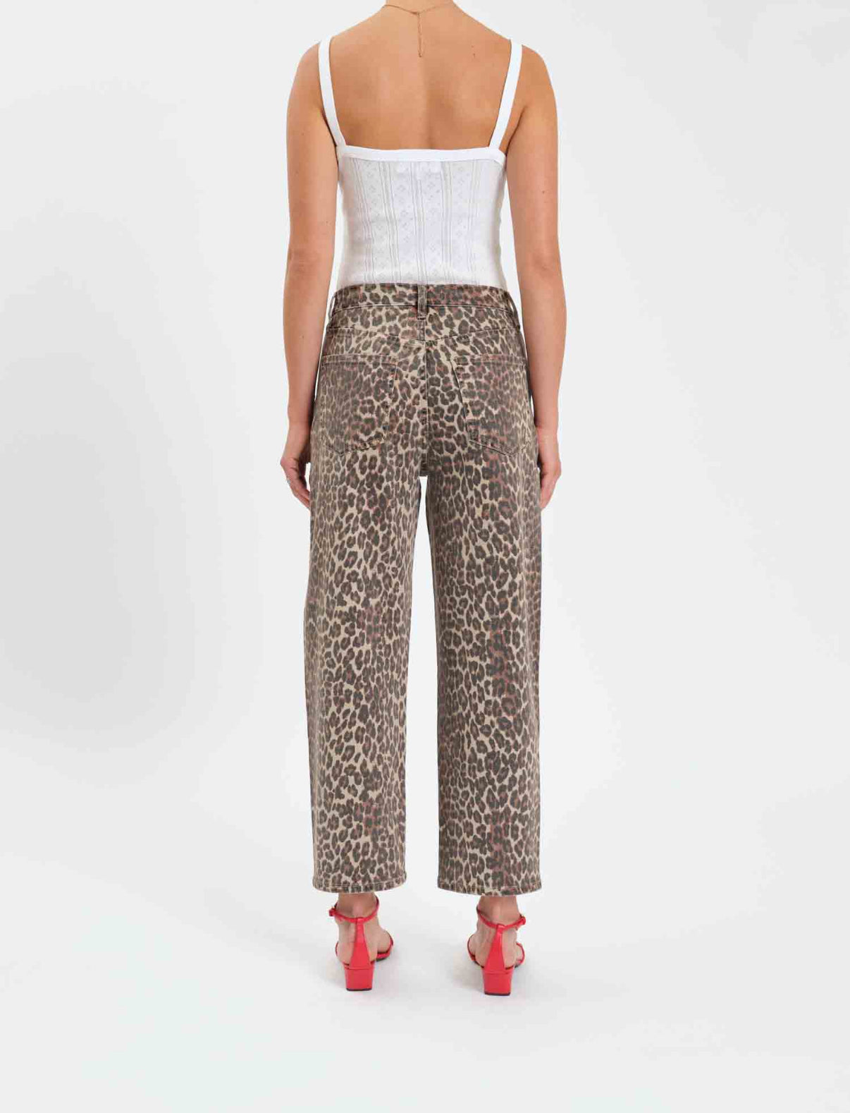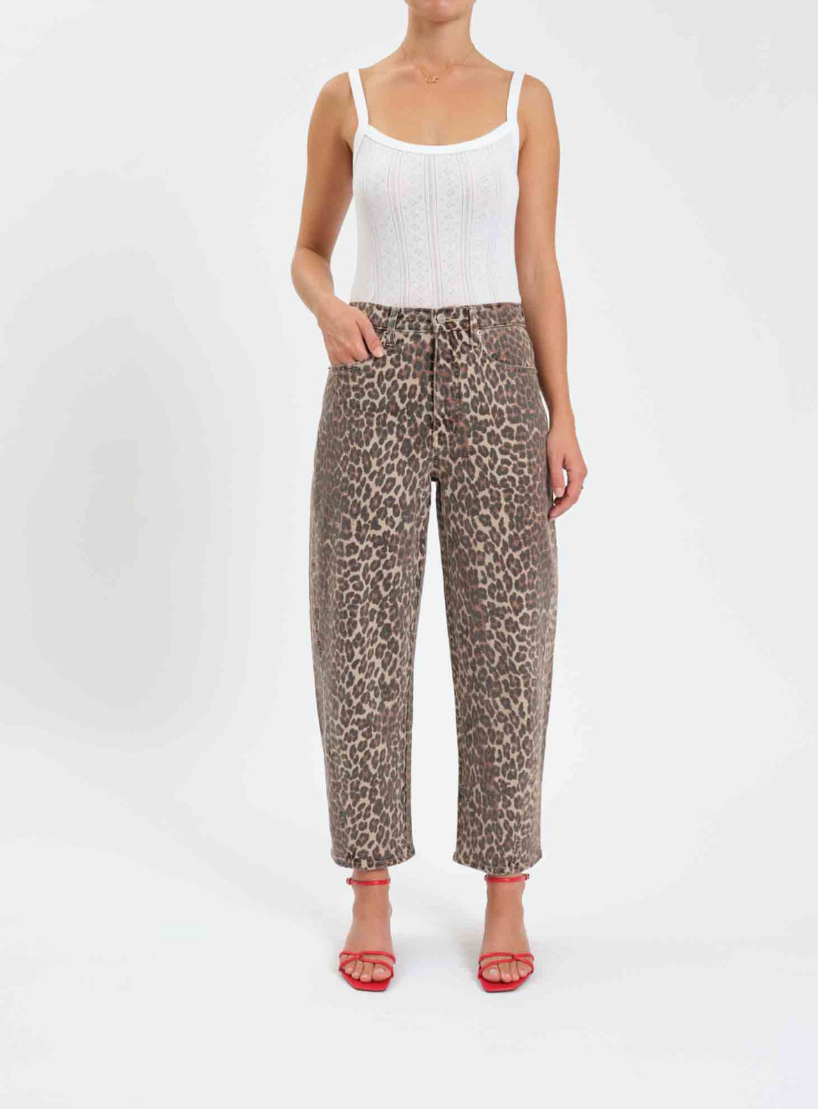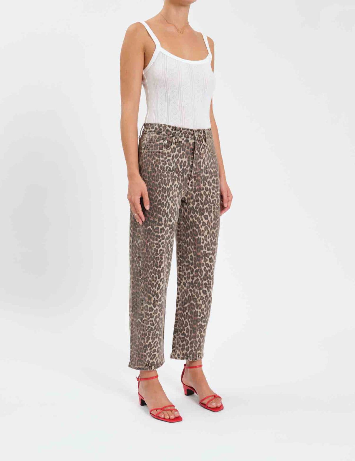 Make a statement in the print of the season. The Westward in Cool Cat is a high rise jean with a trending barrel leg silhouette and a tan and black cheetah inspired print. Featuring a cinched waist, bowed leg, and slightly tapered ankle.