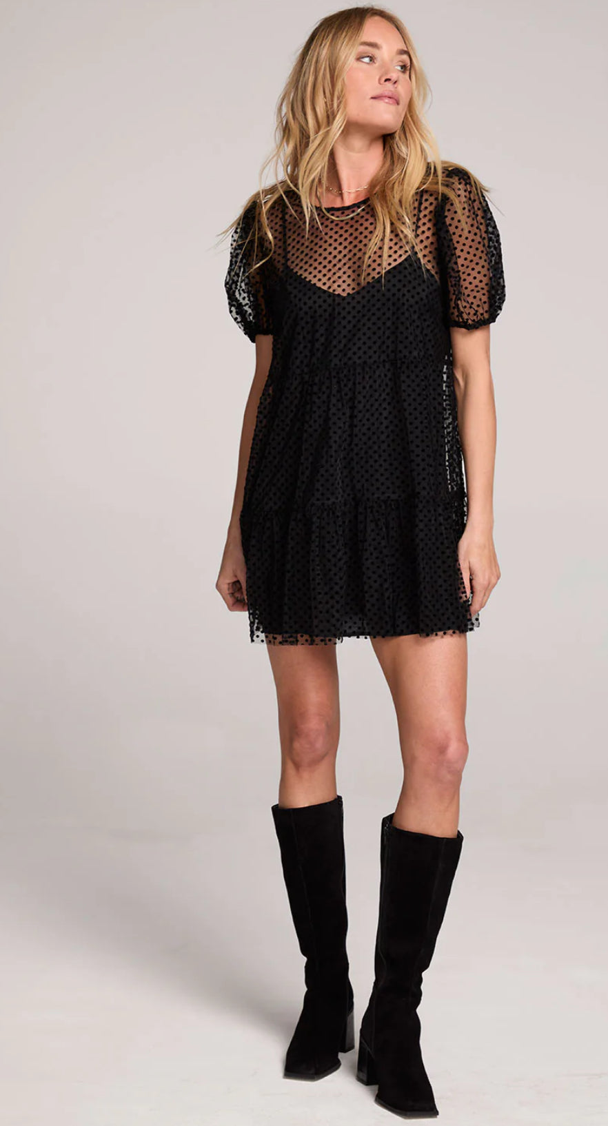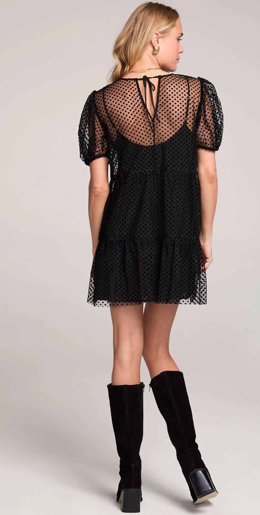 The Yaz Mini Dress features a layered mesh cutout outer layer over a sleek slip dress interior, creating a moody and romantic silhouette.