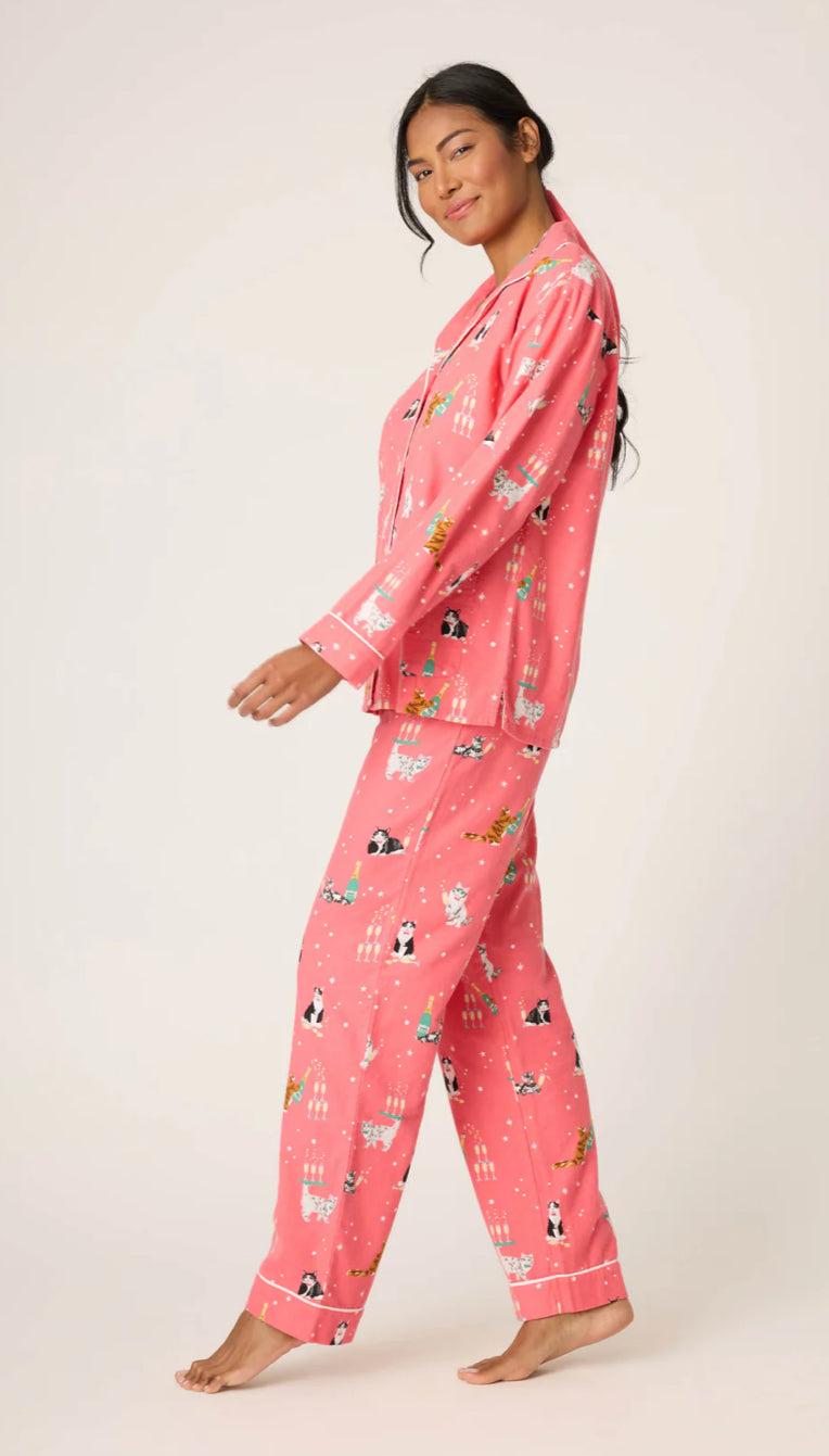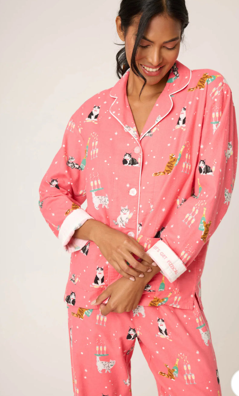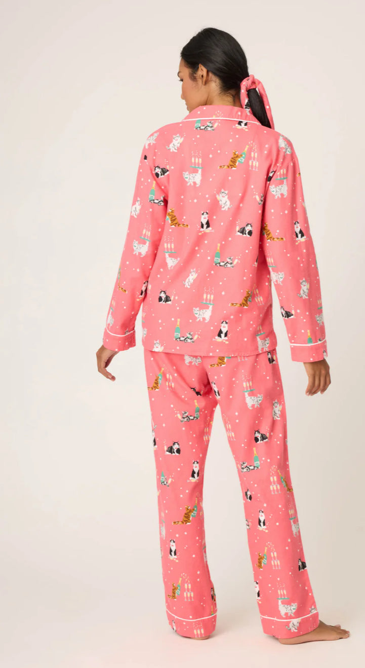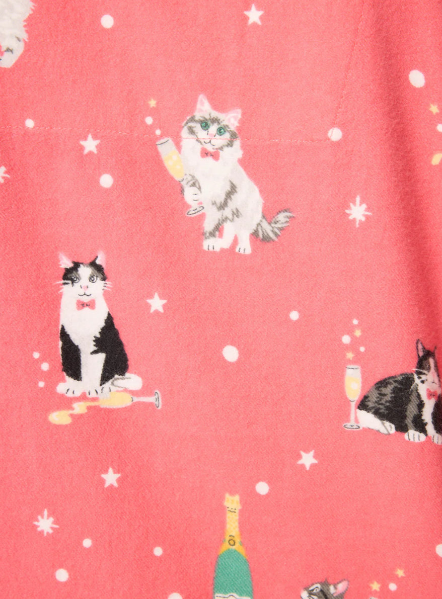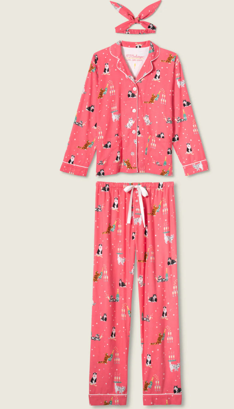 Feel-ine festive, this three-piece flannel set is made from soft cotton in a classic twill weave, complete with a button-front top, relaxed drawstring pants, and a matching headband. The coral backdrop is covered in cats sipping champagne and clinking flutes, finished with contrast piping and a cuff that cheekily reads “Let’s Get Fizzical”—purr-fect for holiday lounging, bubbly nightcaps, and curling up for a catnap.