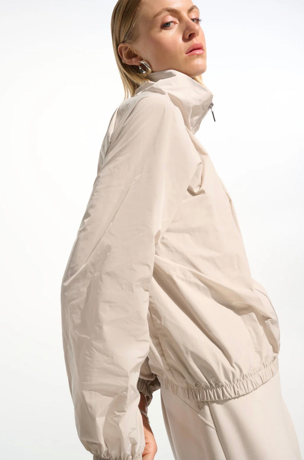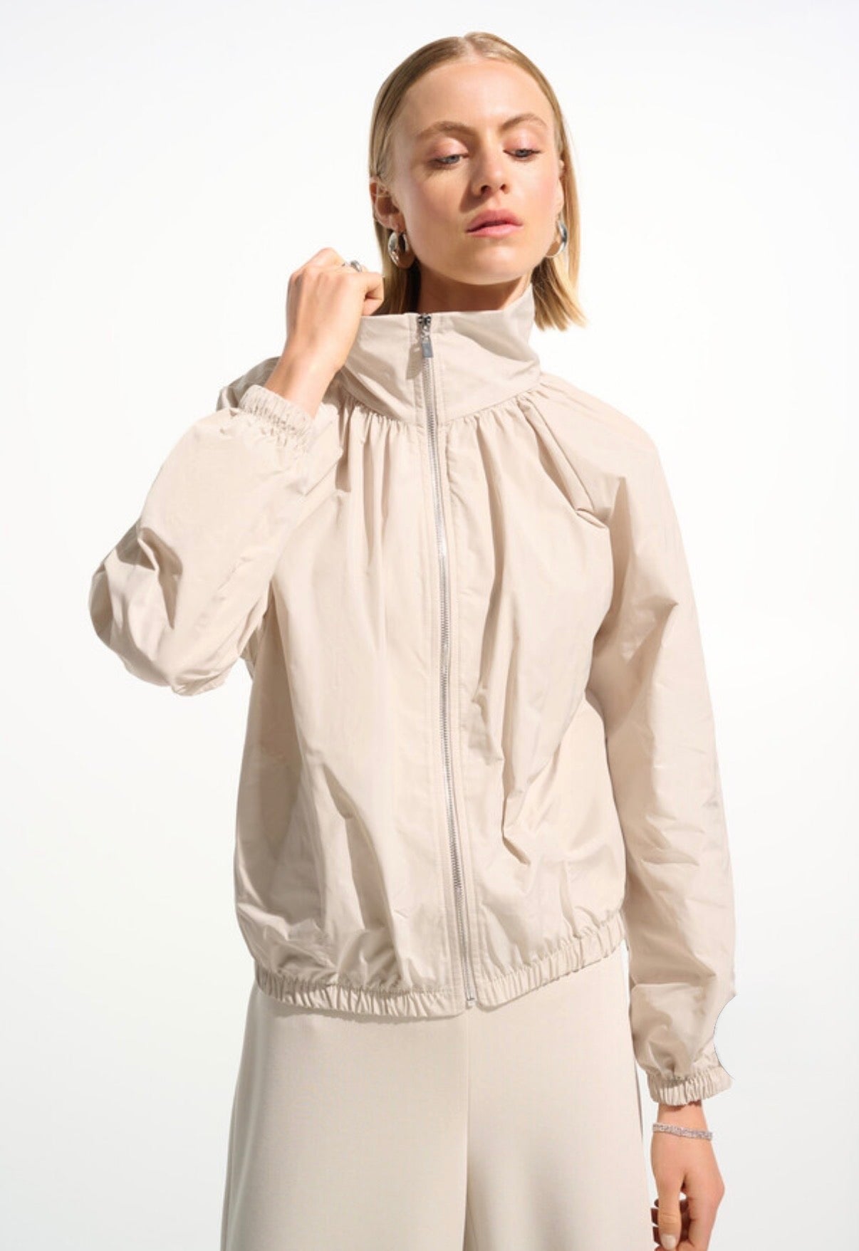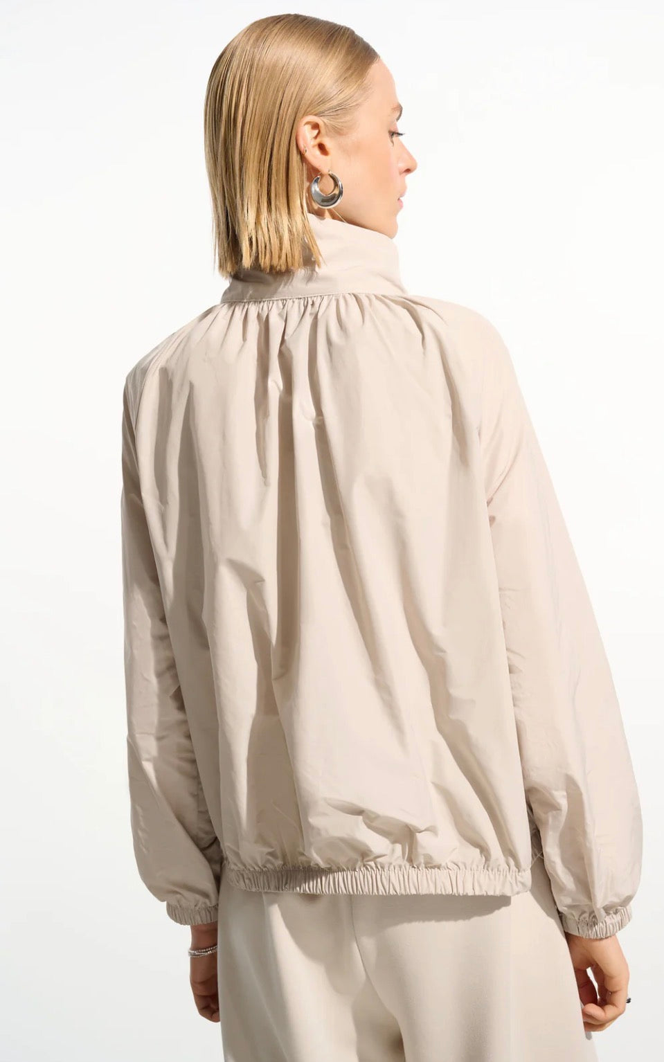Beige windbreaker jacket. Ruching and front zip. Elasticized bottom.
