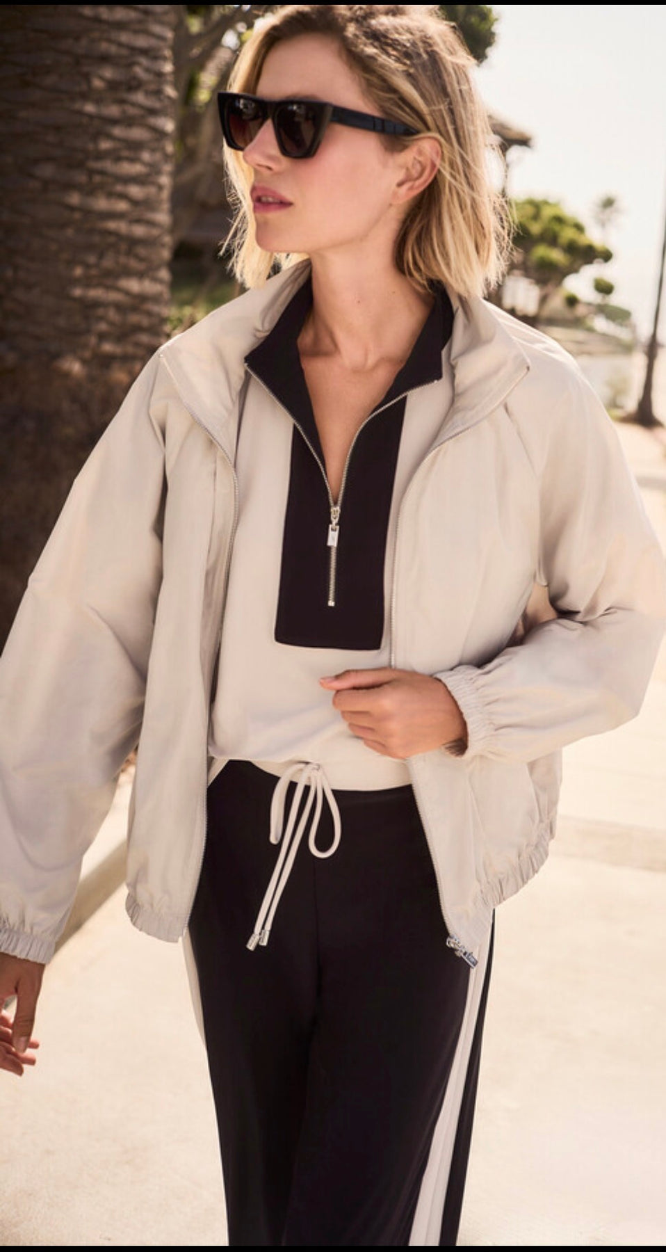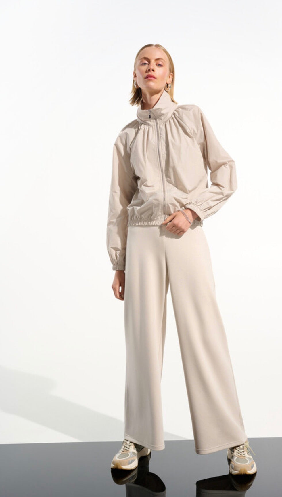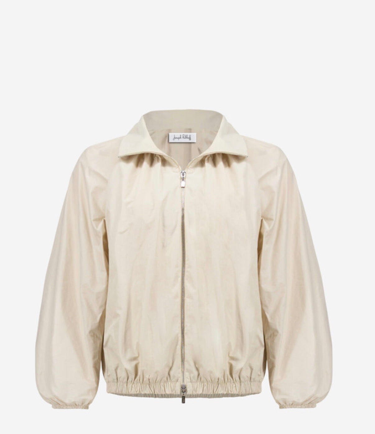Beige windbreaker jacket. Ruching and front zip. Elasticized bottom.
