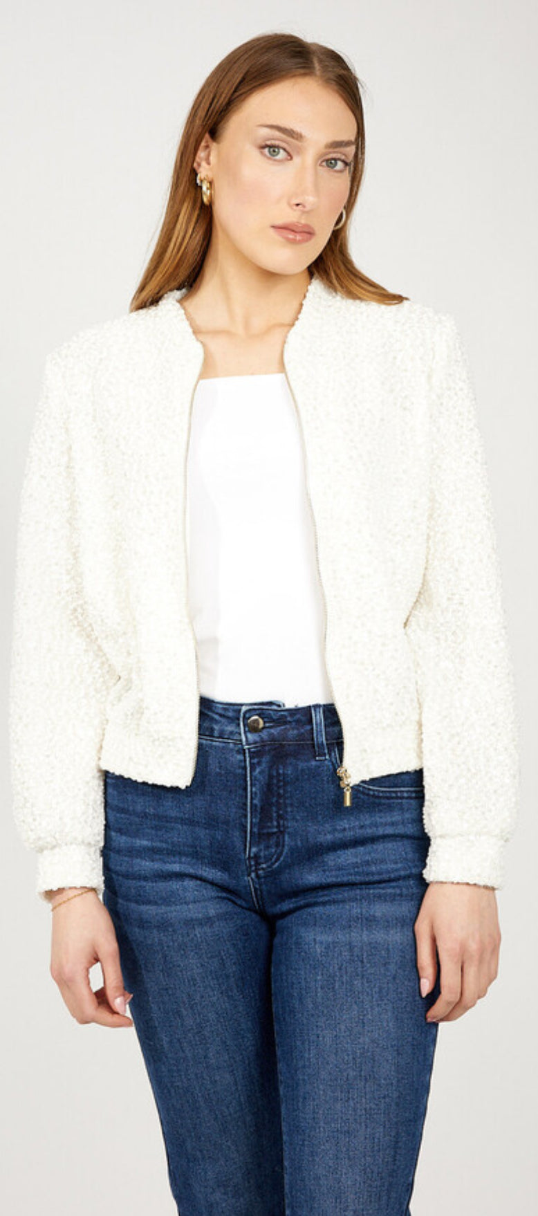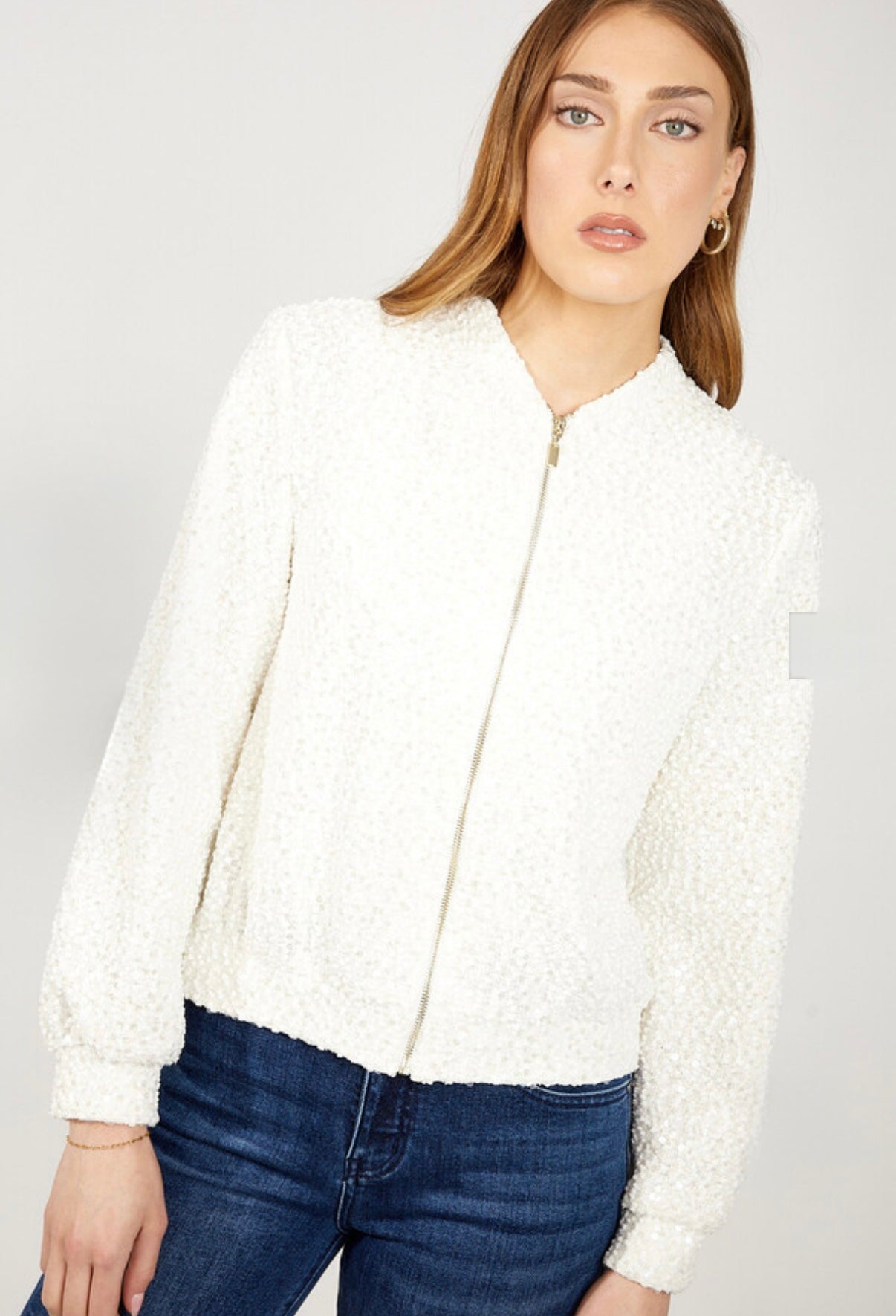Stand out from the crowd with our Dressy Knit Jacket. The winter white color adds a touch of elegance, while the sequins give it a playful and fun twist. Its zip front makes it easy to dress up or down, so it's perfect for any occasion. Stay stylish and warm in our Dressy Knit Jacket!Winter white.