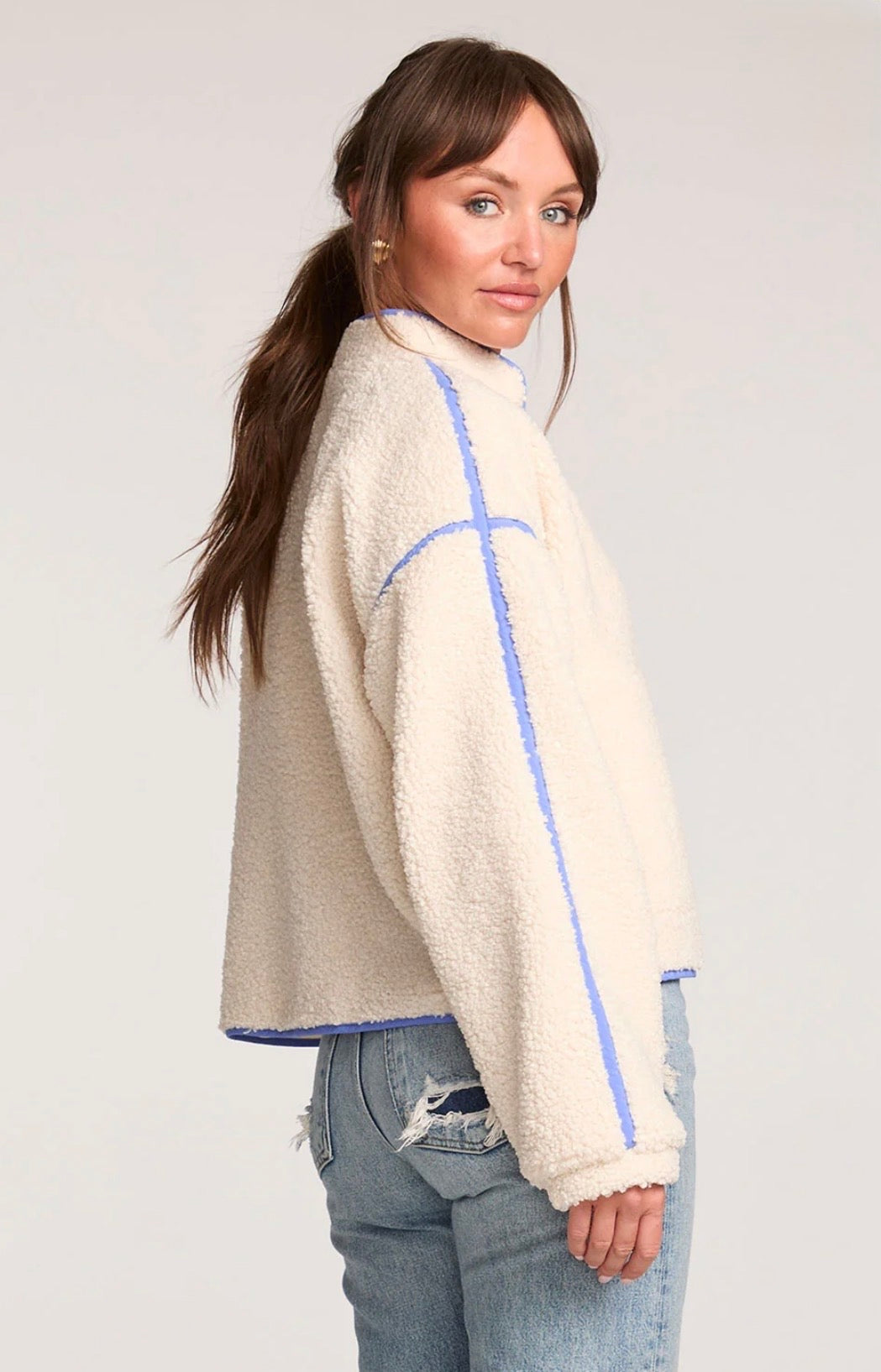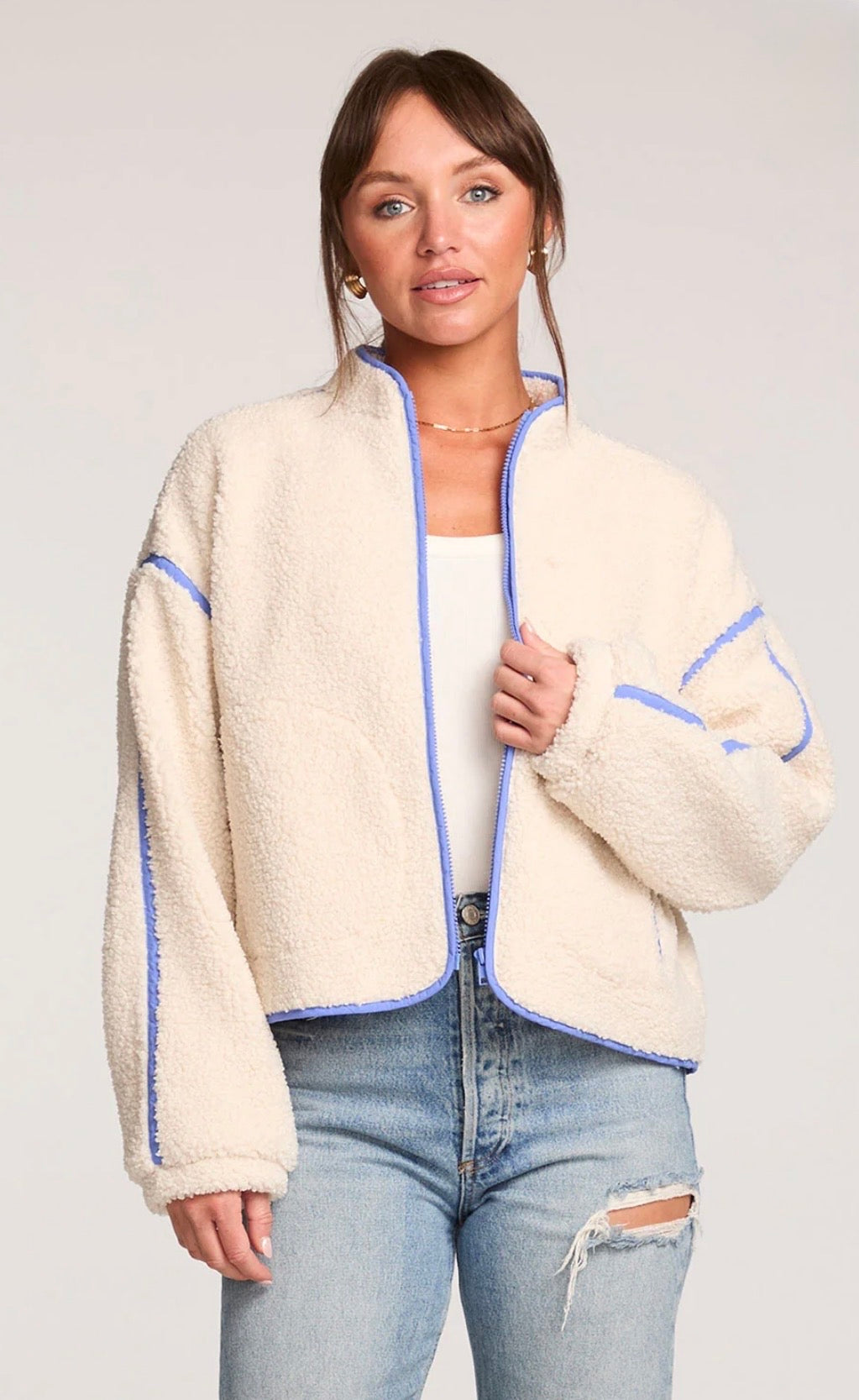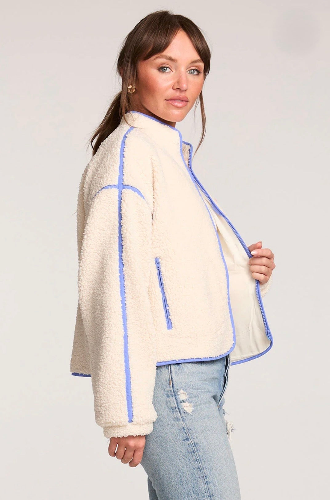 The Brenwood Salt Jacket features a kimono-inspired design with a high collar and a loose, flattering fit.
