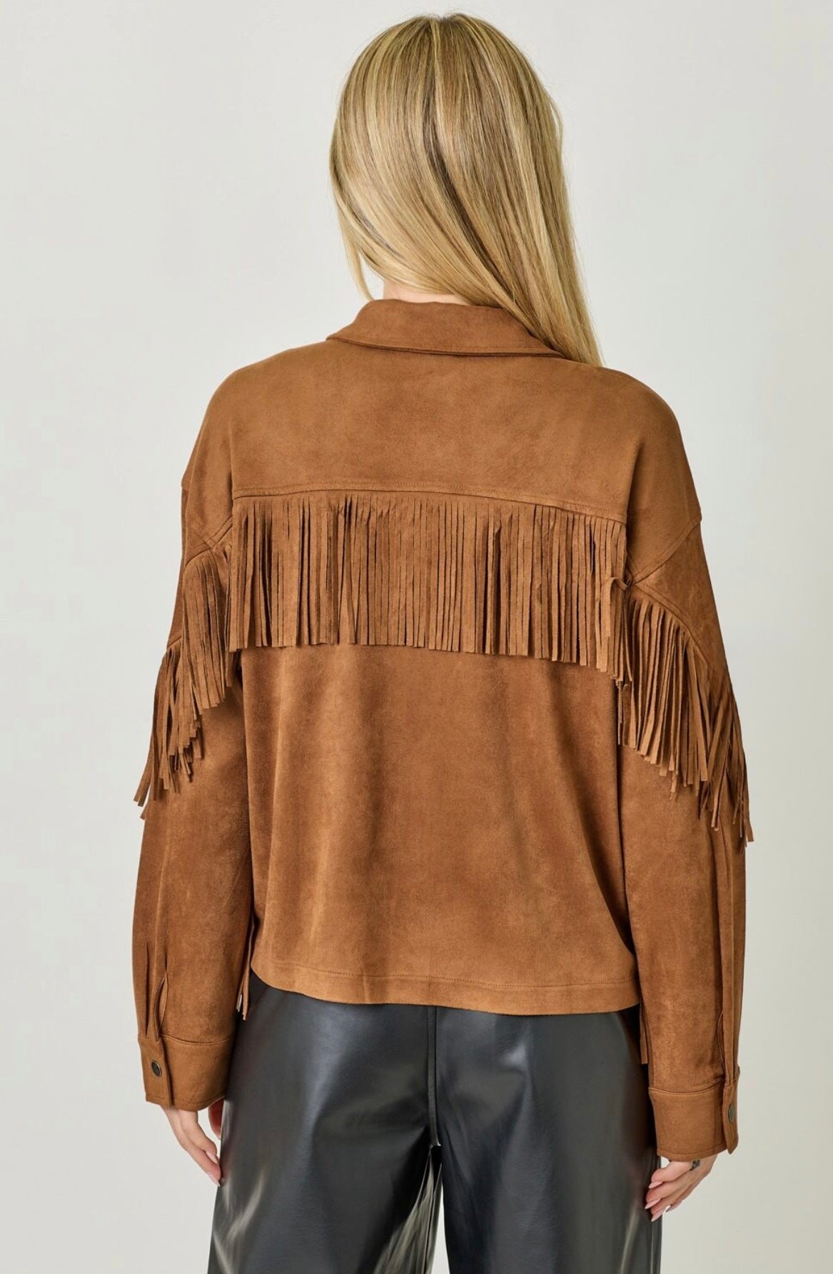 Suede fringe back shirt jacket