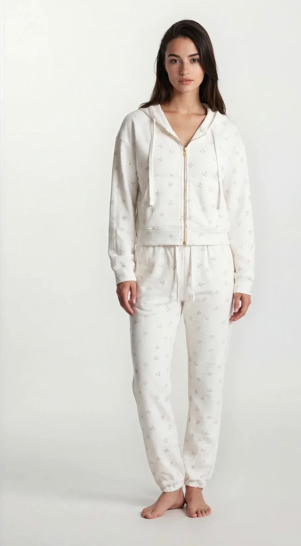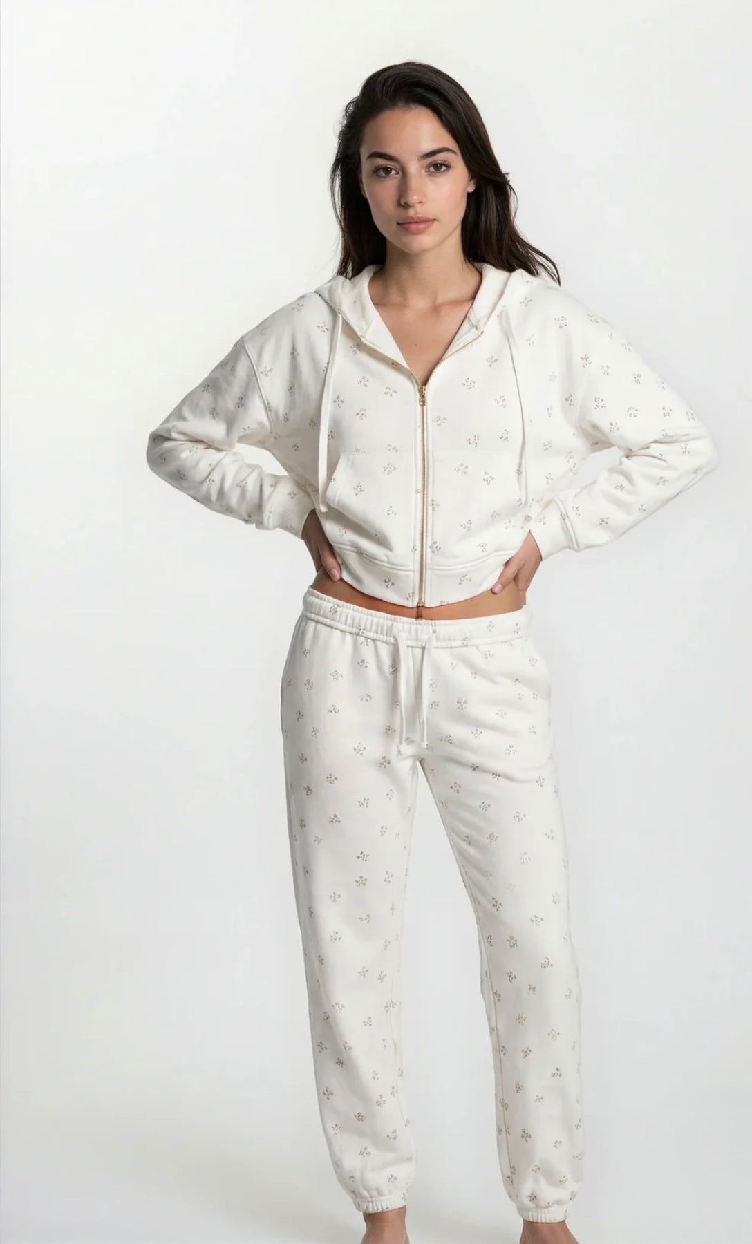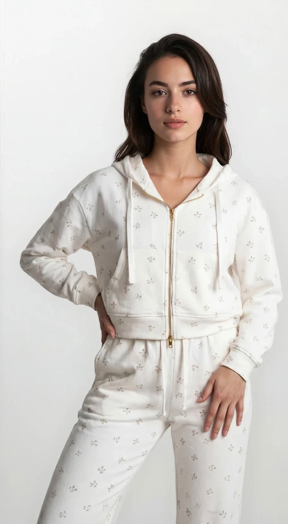 Discover the Camille Leisure Set—your perfect escape from the ordinary. This delightful two-piece combines a feminine hoodie and matching joggers in our eye catching pink and grey floral design, complete with a gold two-way zipper for maximum versatility. Dress it down for cozy nights in or elevate it for casual outings—this set seamlessly transitions between moods. Pure comfort wrapped in playful style.