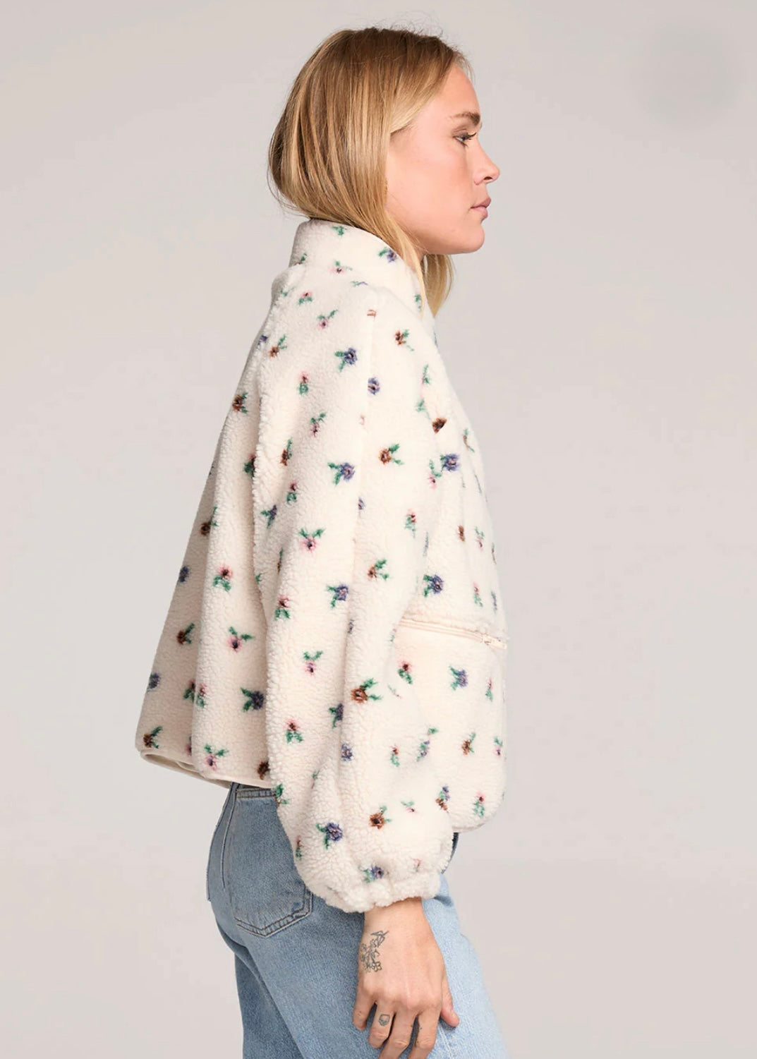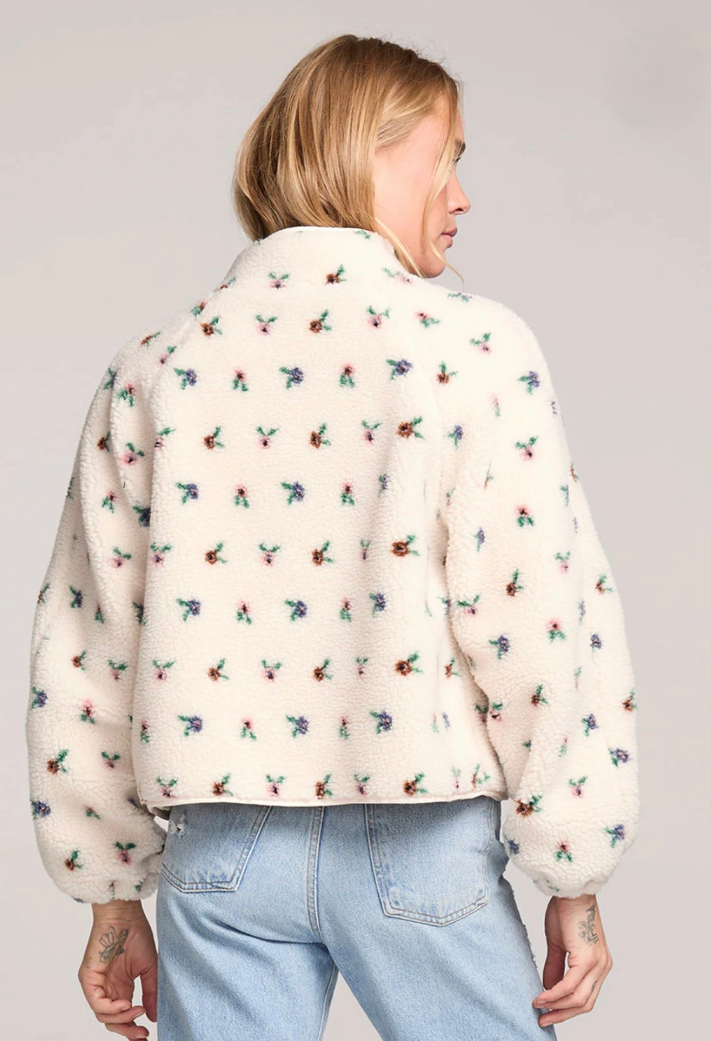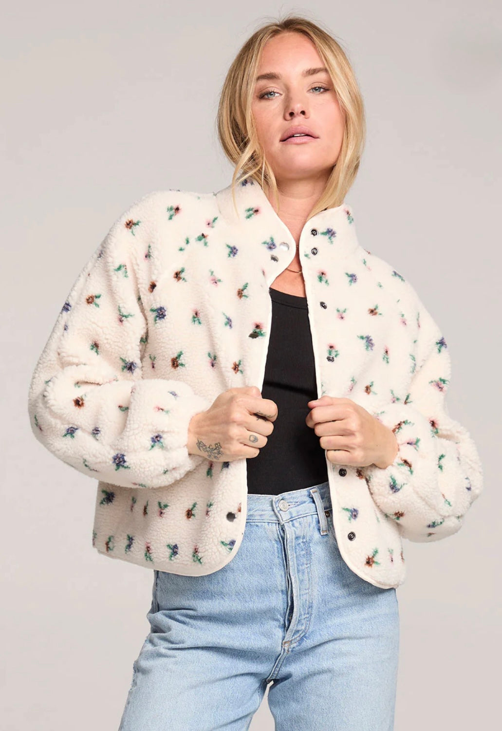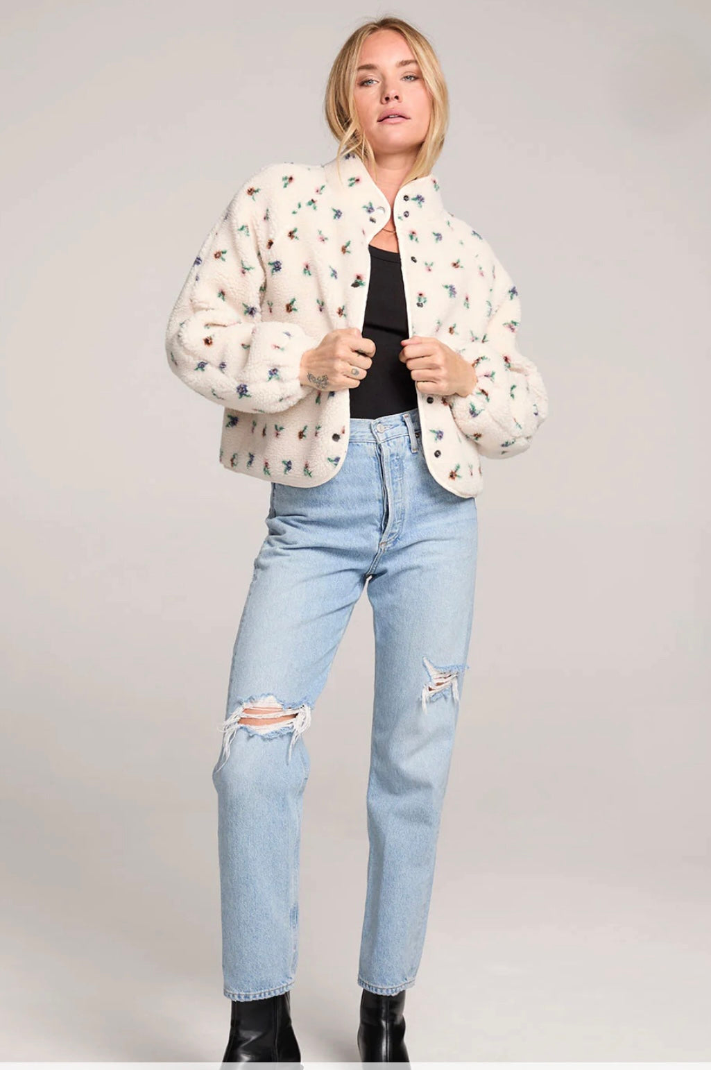 The Deeda Jacket reimagines the classic bomber silhouette with a soft, fluffy fabric adorned by a delicate petite floral motif.