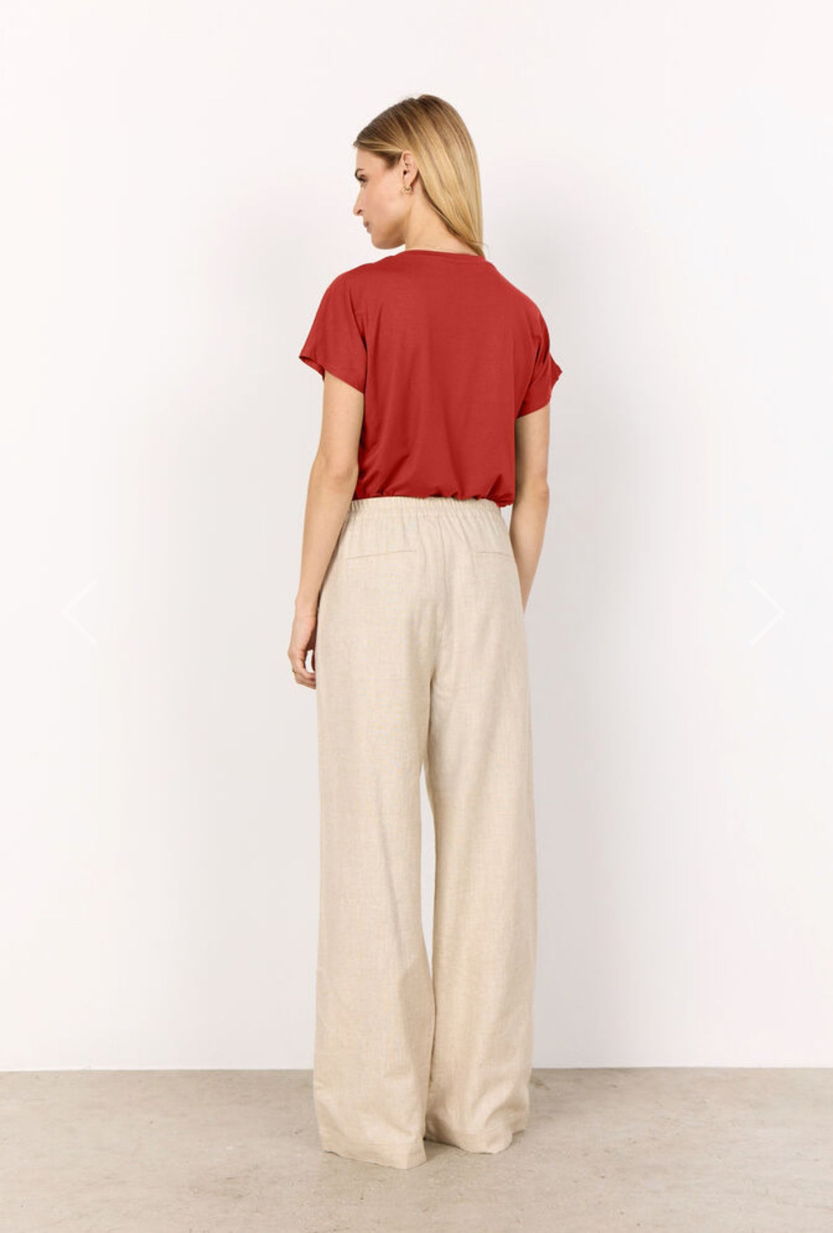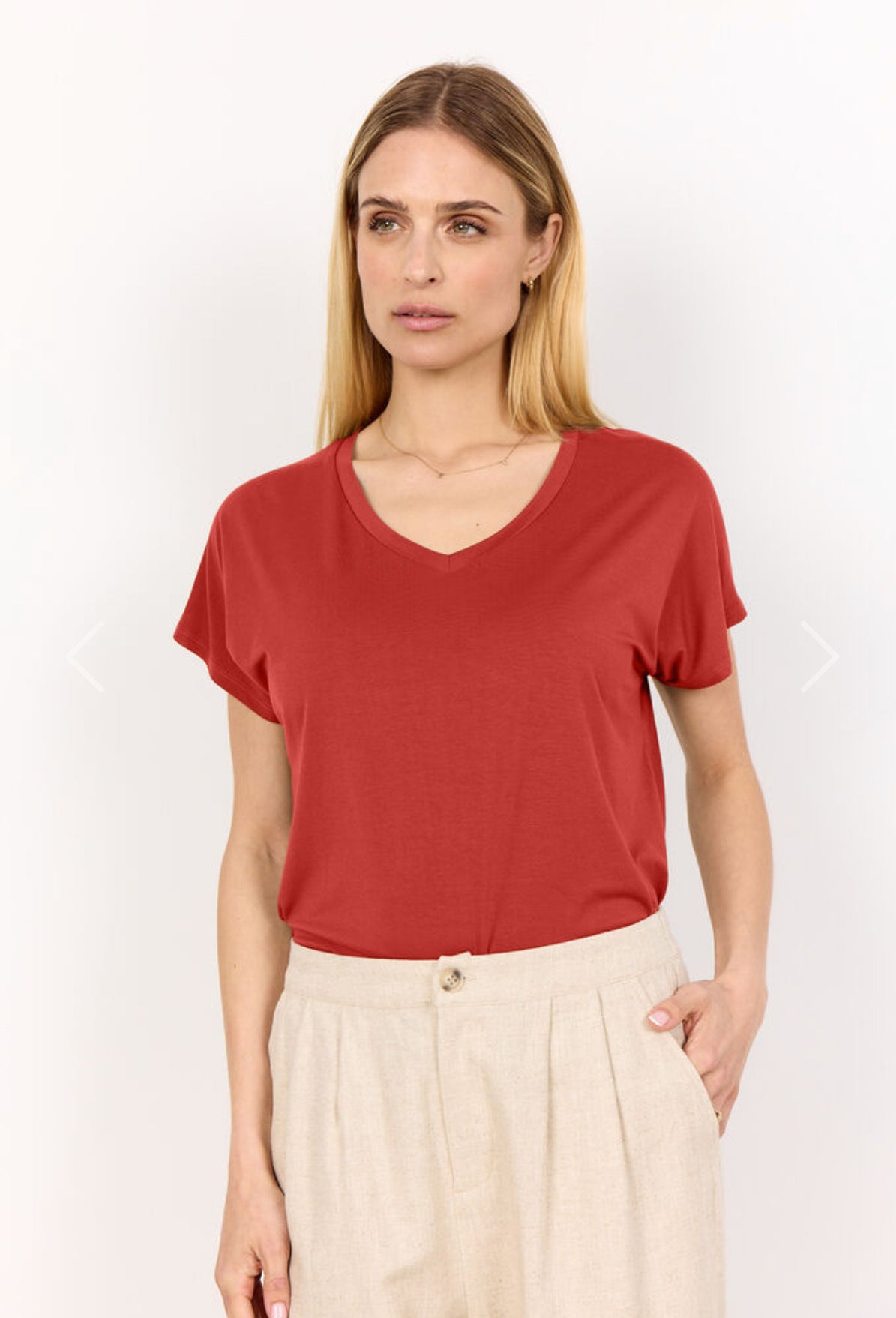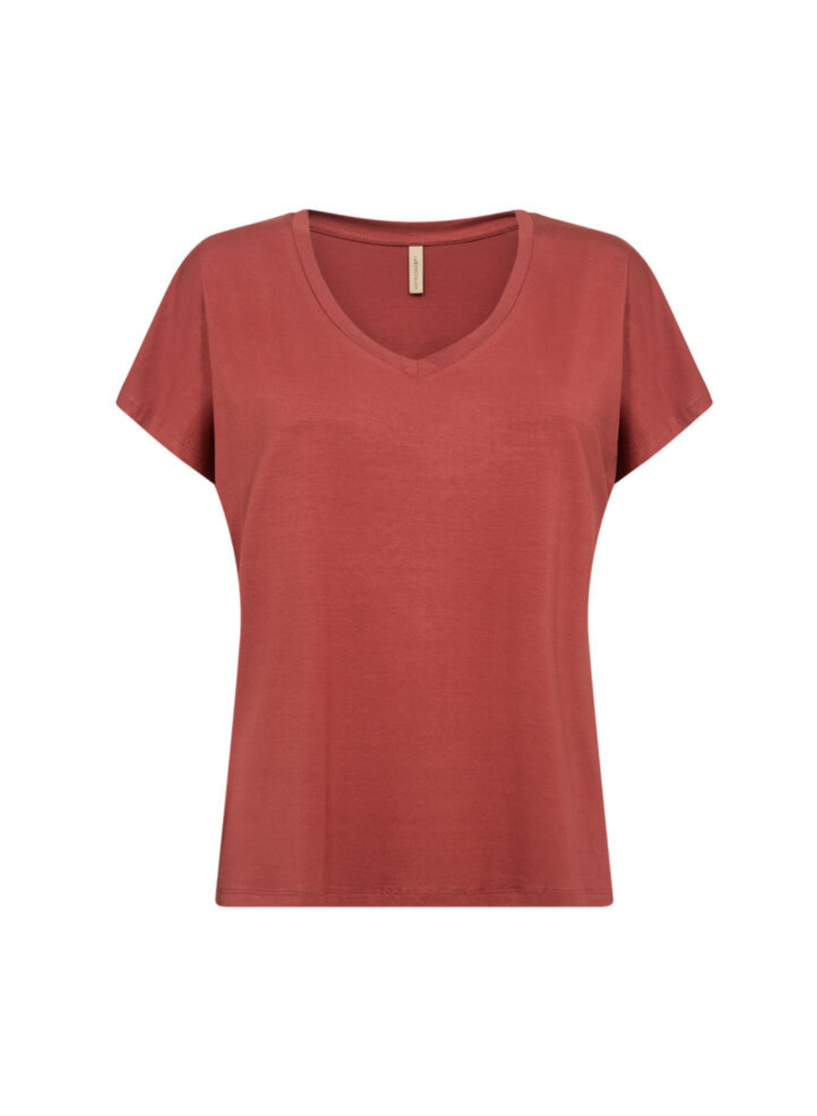 Soft knitted t-shirt, long sleeves, mineral red in color.