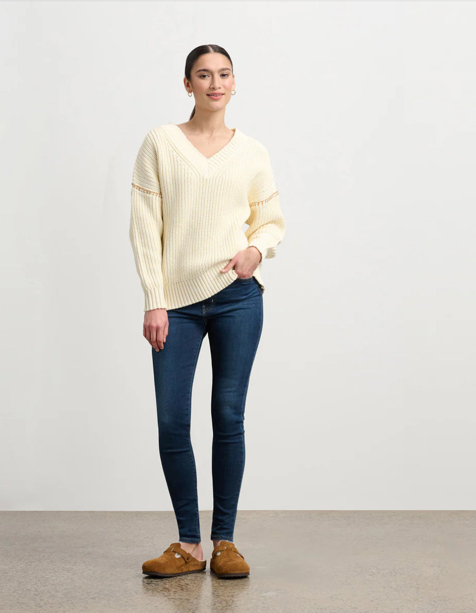 The V-Neck Slouchy Sweater in Cream is a relaxed knit that feels both cozy and sophisticated. With dropped shoulders, whipstitch details, and ribbed trims, it’s designed for effortless styling. The cotton fabric makes it breathable yet warm for transitional weather. A versatile women’s sweater that pairs easily with skirts, trousers, or jeans.