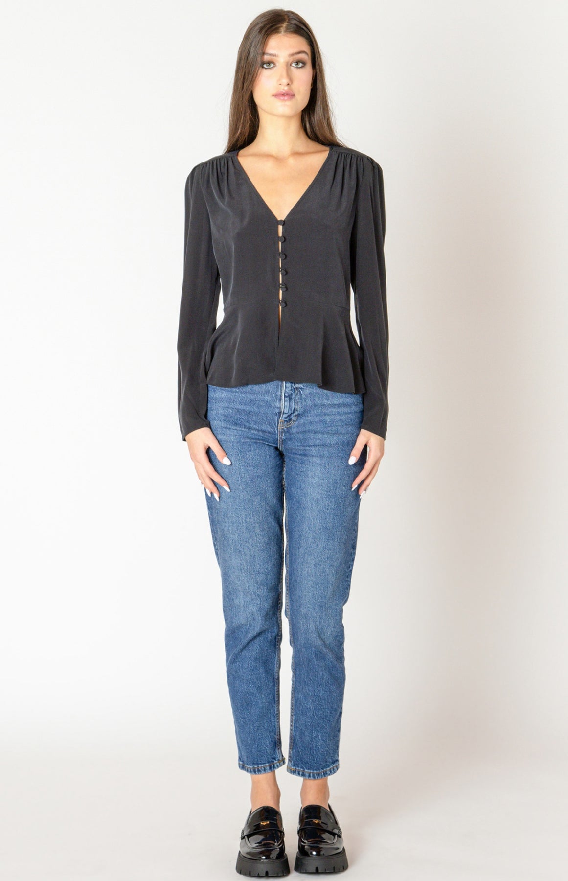 Button front blouse with peplum detail