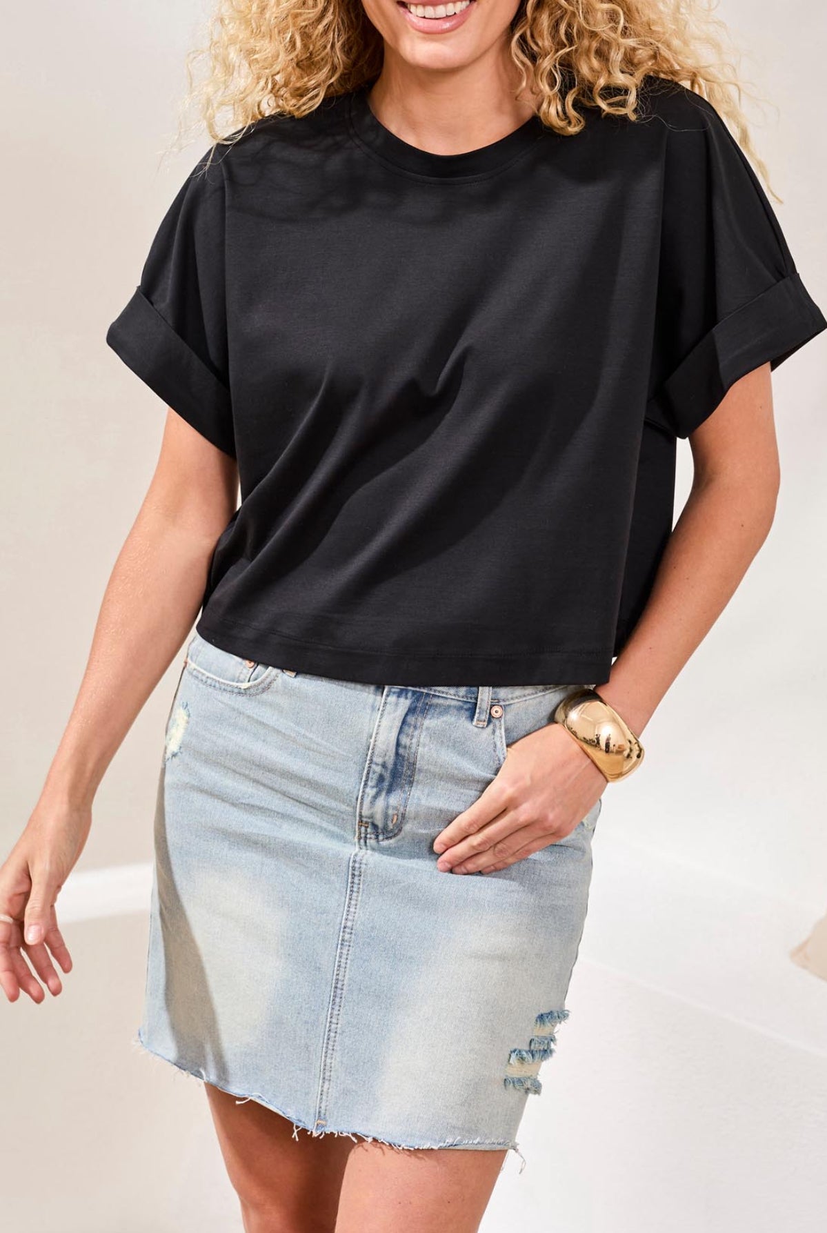 Opt for easy everyday style in this relaxed T-shirt, crafted from soft-touch mercerized cotton knit for ultimate comfort. The loose fit allows for effortless movement, while short cap sleeves keep it feeling trendy. Featuring ladder tape detail at the shoulder seam, this piece elevates your casual look with a refined touch.