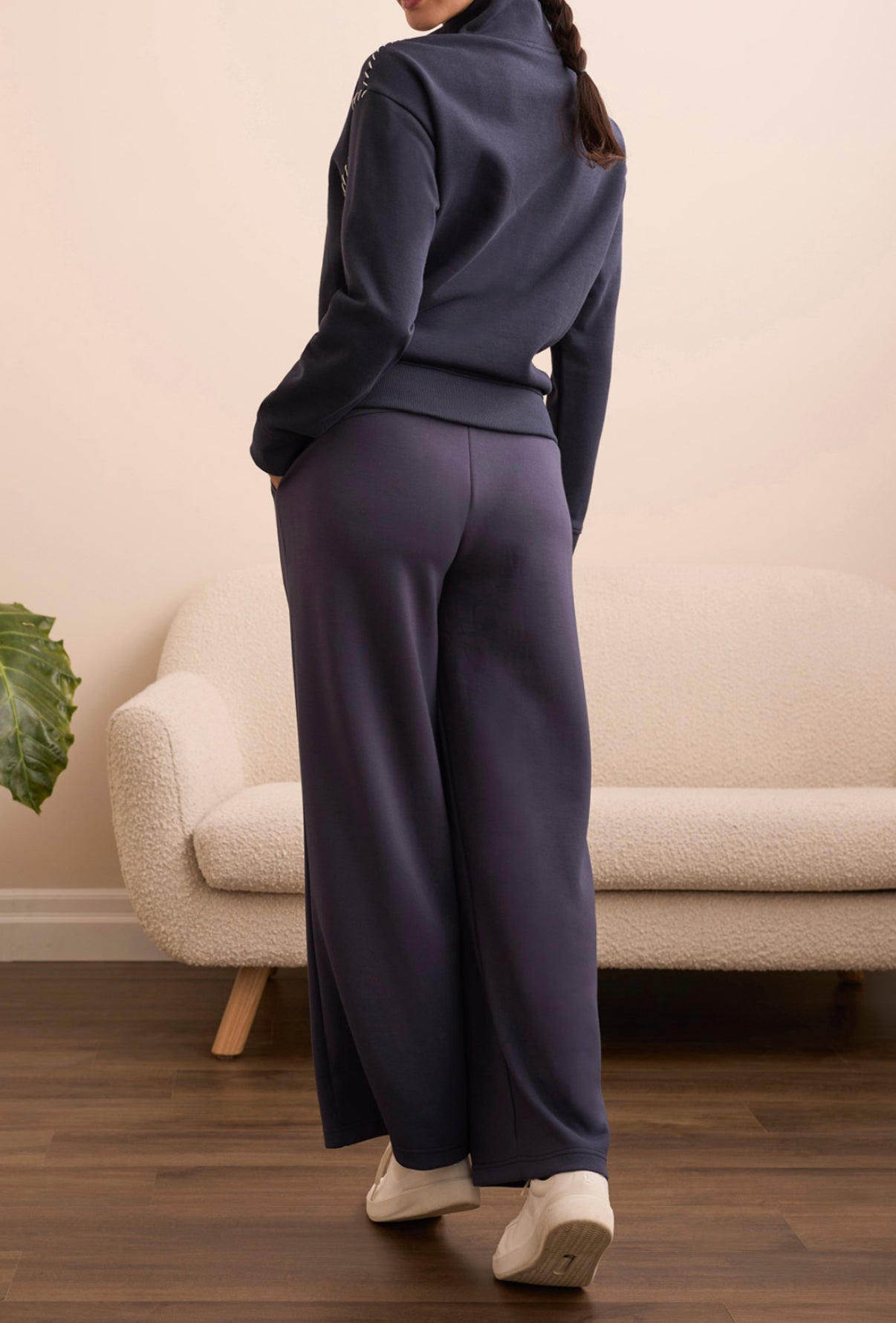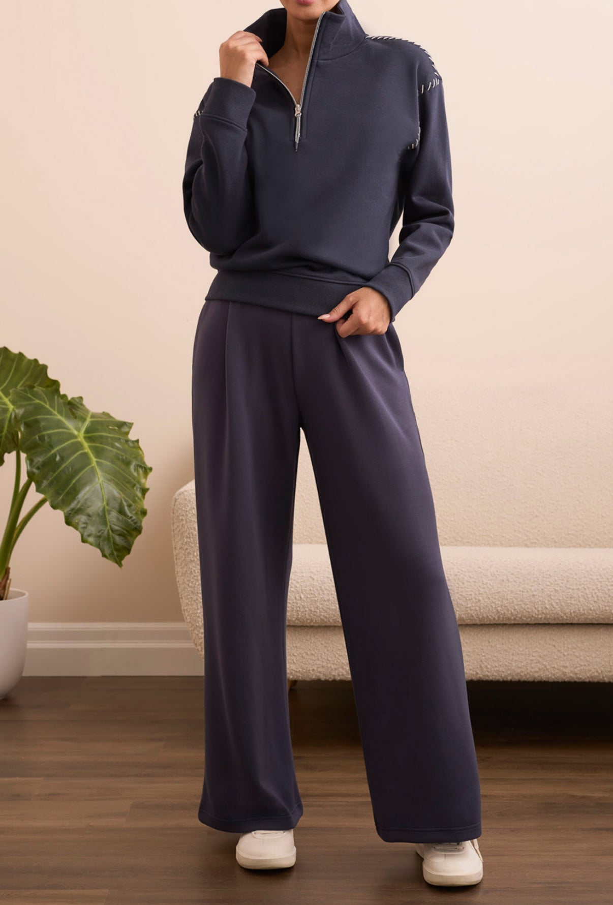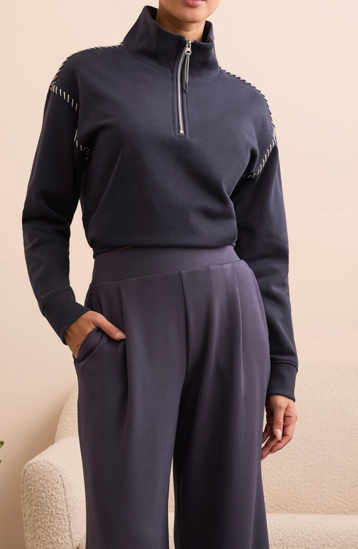 Long-sleeve funnel neck top w/ stitching.