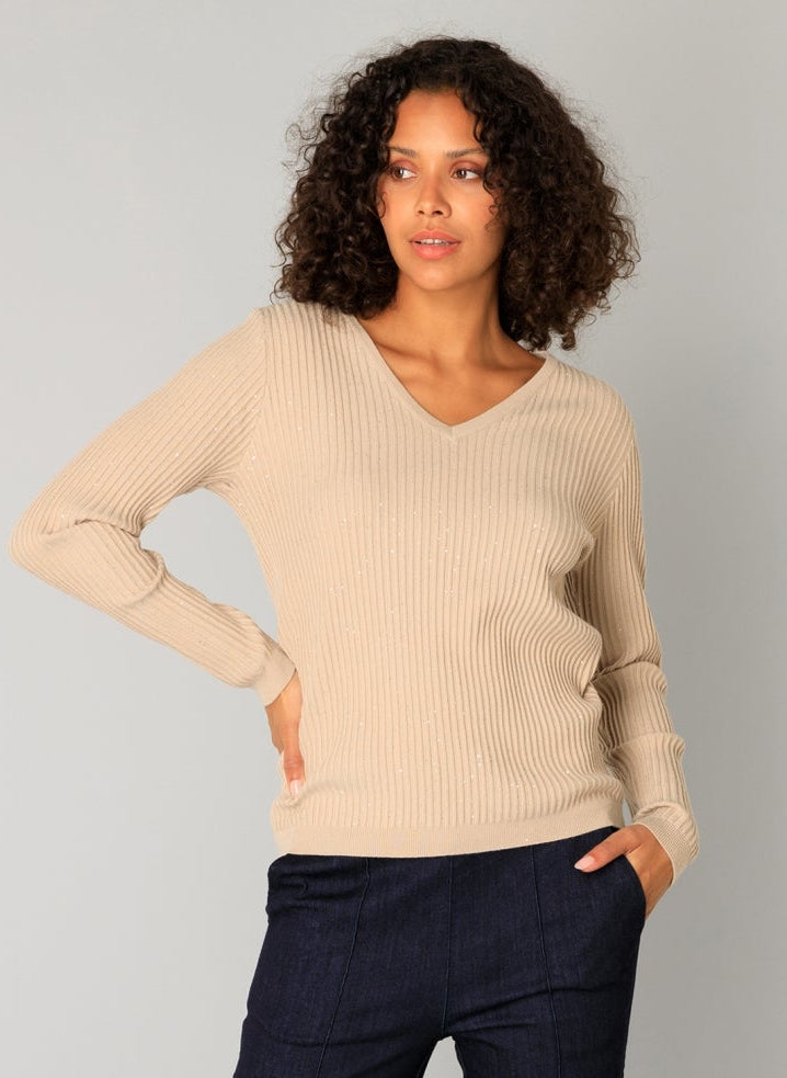 This sweater is rib-knit in a thin quality that is supple to wear and feels light. The V-neck and regular fit create a timeless style, while the fine sequins subtly catch the light. Perfect for adding that little bit of sparkle to a basic outfit.