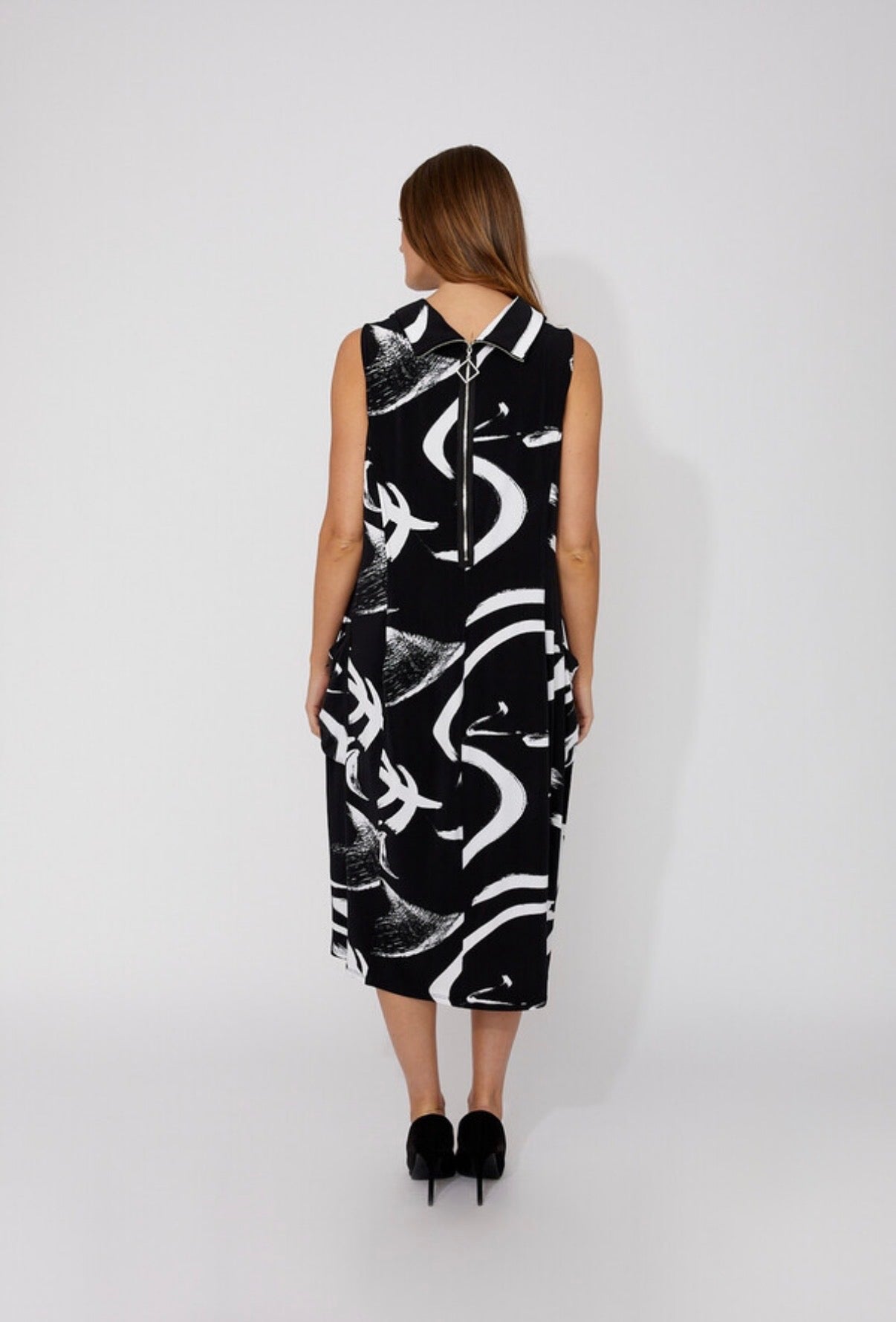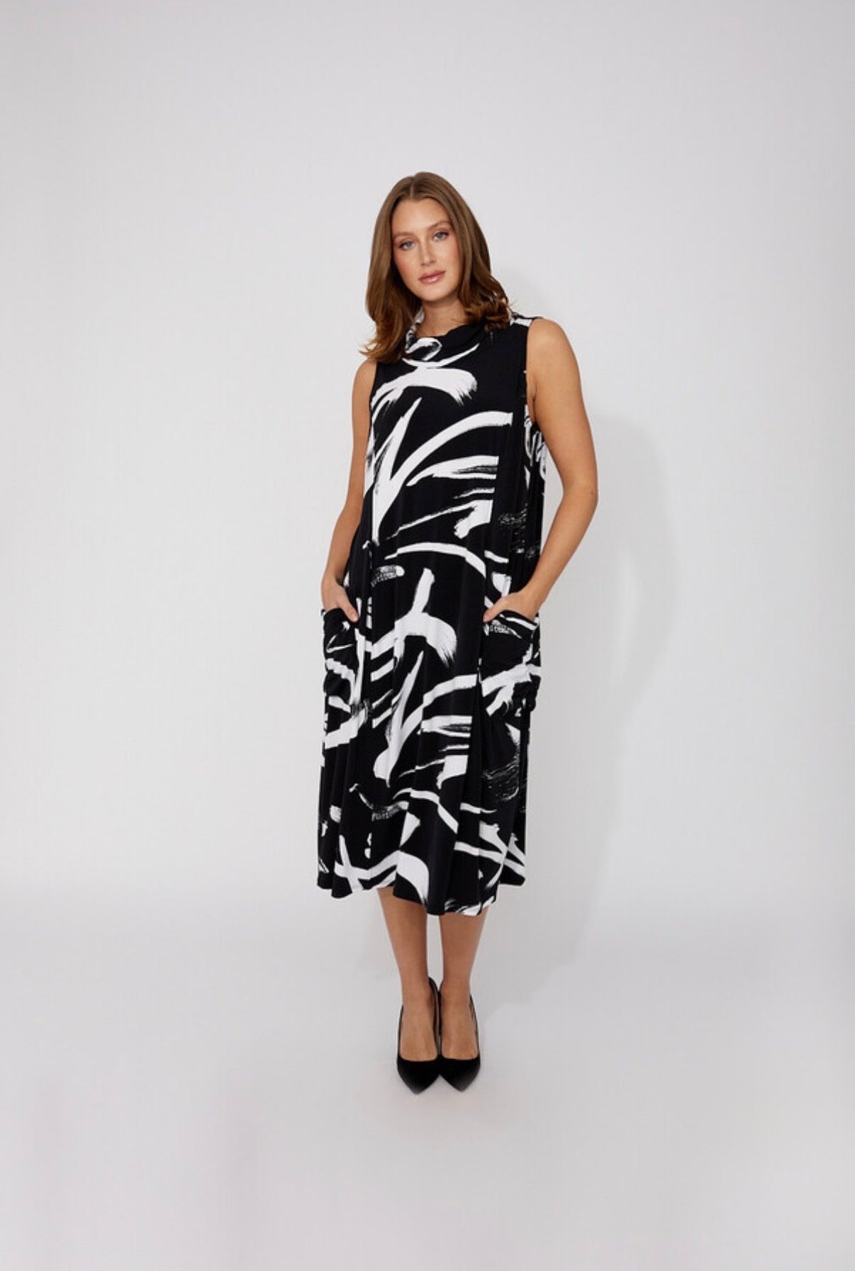 Step into effortless elegance with the Frank Lyman A-line midi dress. Perfect for casual summer outings, this dress features a round-neck and sleeveless design, offering a breezy feel. The abstract pattern adds a touch of modern flair, while the convenient pockets enhance its practicality. Embrace a feminine style that combines comfort and sophistication seamlessly.