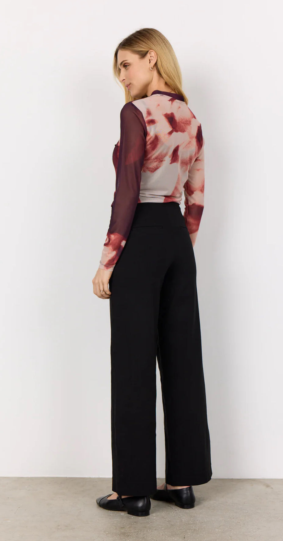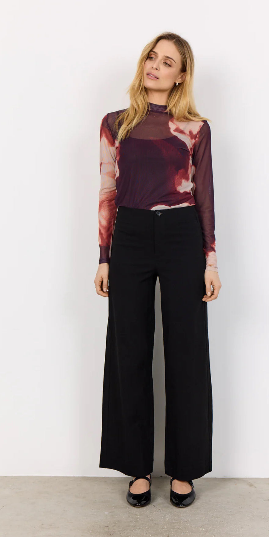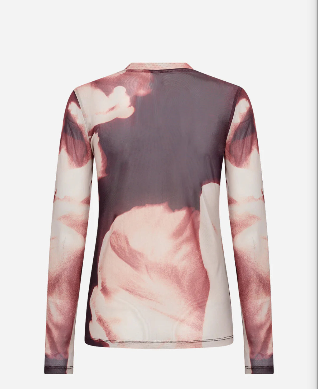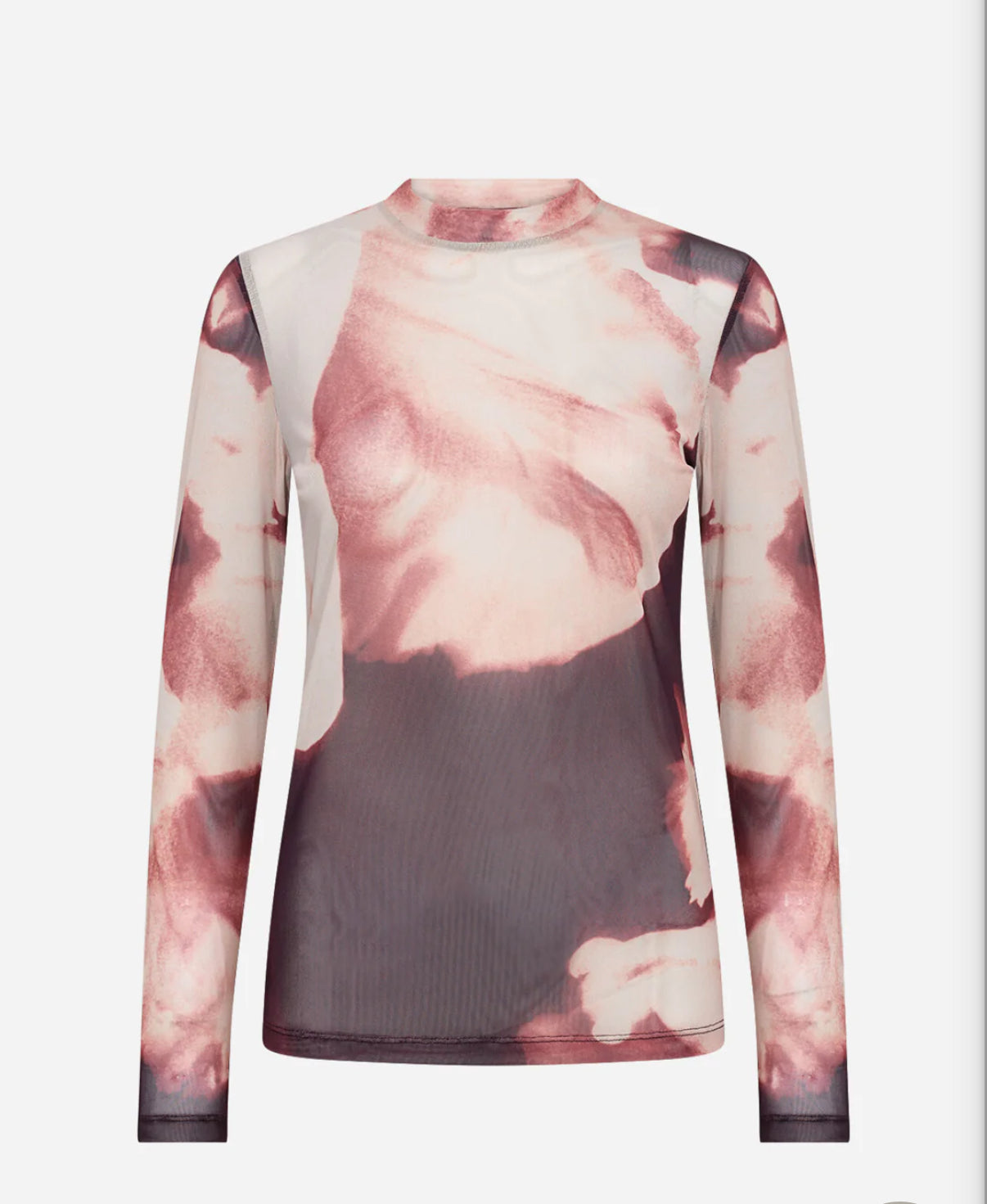 ALDA T-shirt made of 95% Recycled Polyester, 5% Elastane. The T-shirt has a high neckline, long sleeves, and an elegant abstract print. Pair it with jeans or a sleek skirt for a cool, unique look