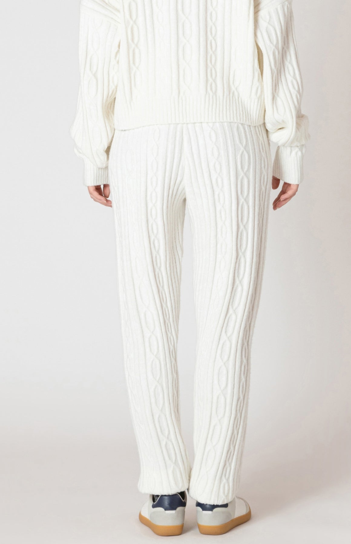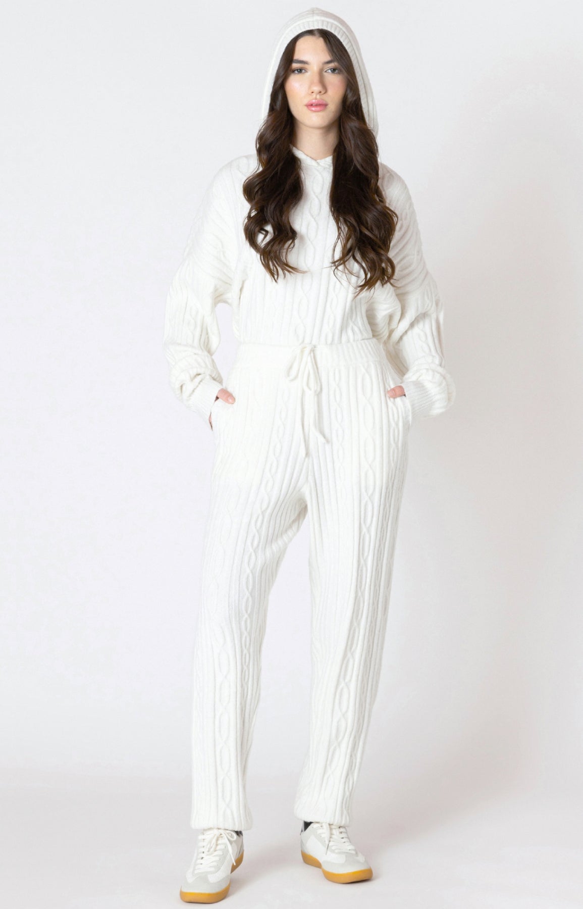 Cable knit joggers to coordinate with matching hooded cable knit sweater